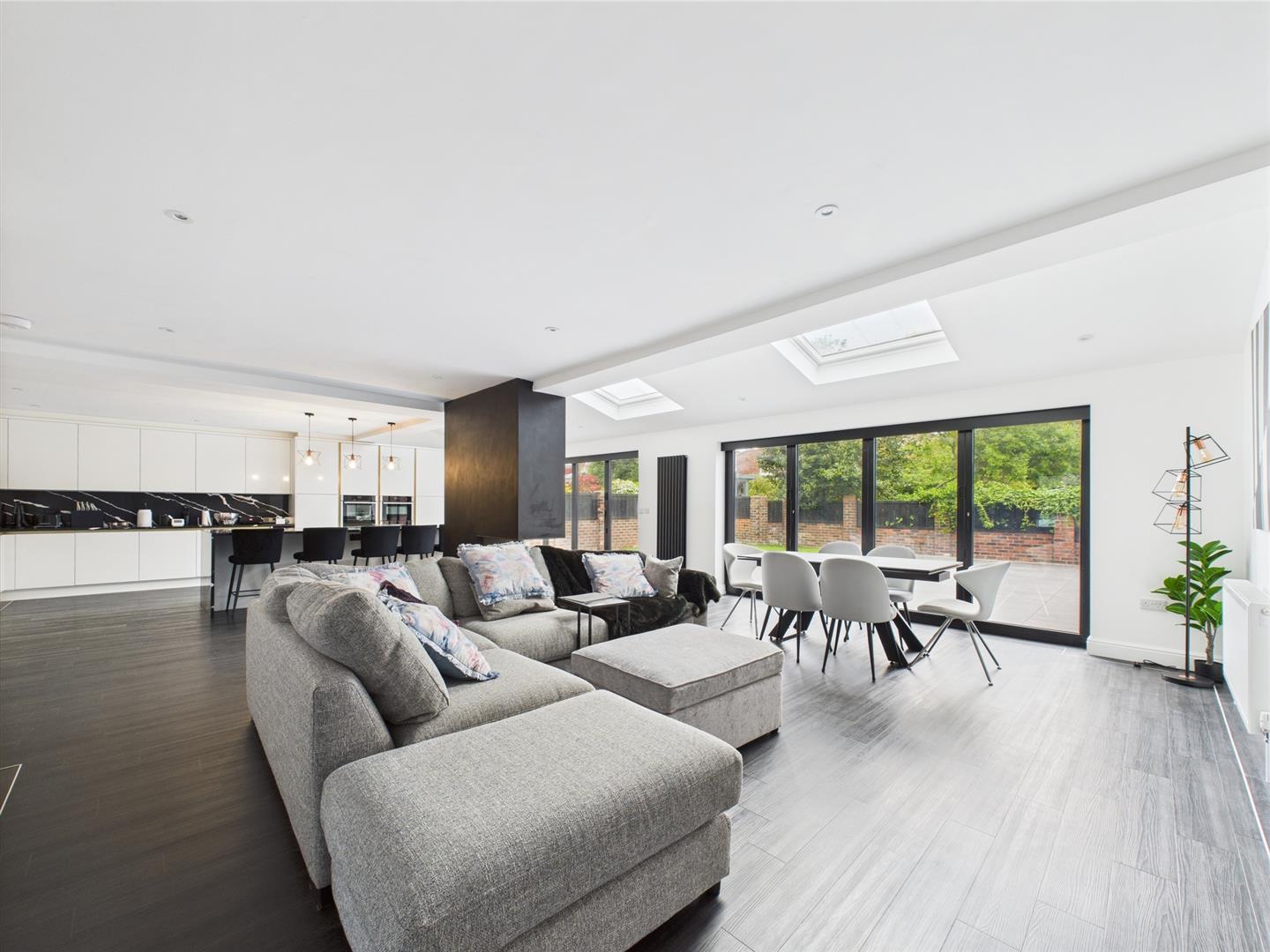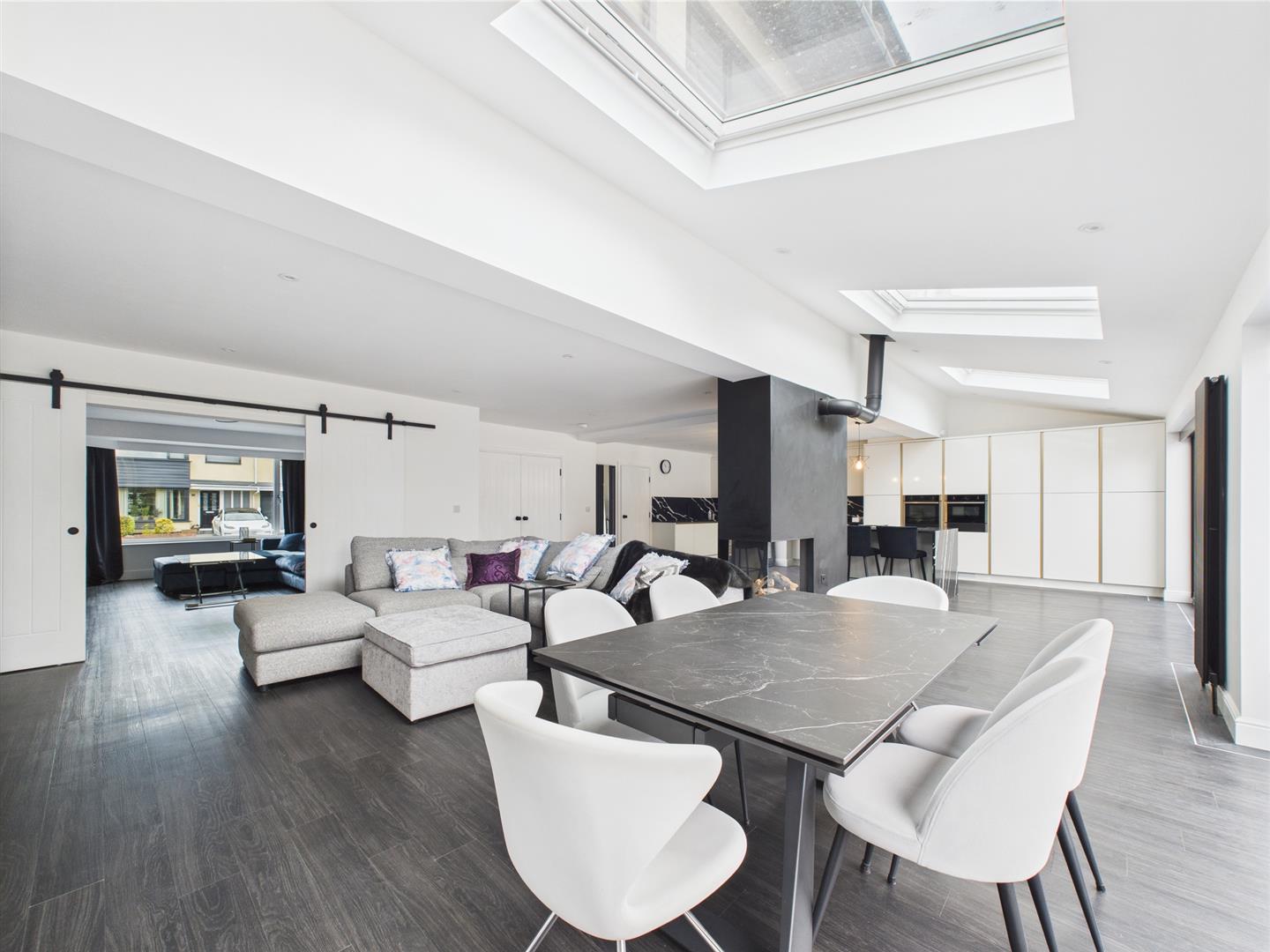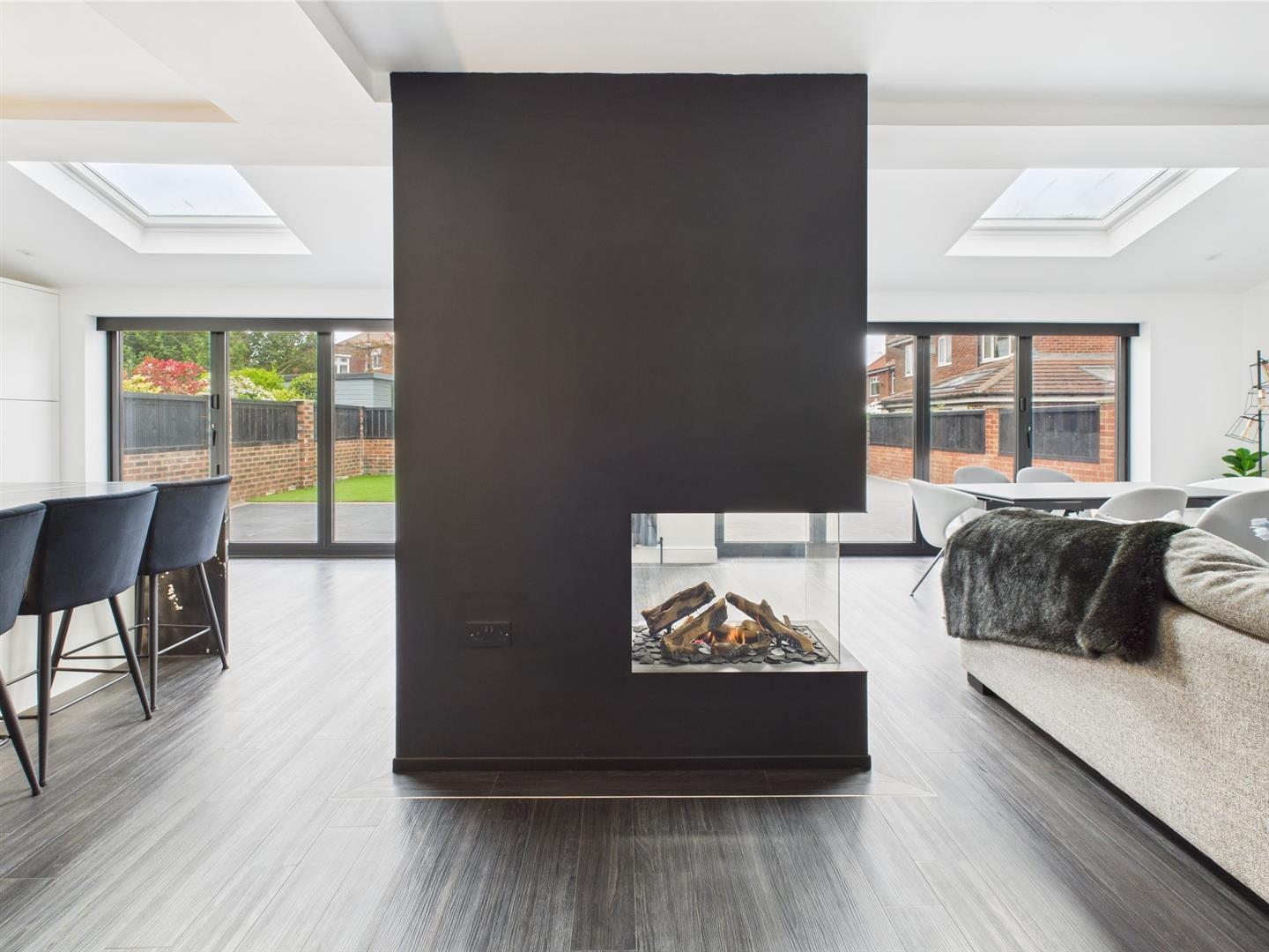 Briefly comprising: Entrance to a welcoming hallway with stairs to the first floor and thoughtfully designed concealed storage, luxury vinyl flooring flows throughout the property. Double doors lead to an impressive open plan kitchen/diner/family room which offers a fantastic space perfect for family living and entertaining. Two sets of bi-folding doors open out to the rear garden and a partially vaulted ceiling with Velux windows allow plenty of light to fill the room. The well equipped kitchen has a modern range of fitted wall and base units including a large central island providing additional storage, seating and housing a Bora induction hob with a down draft extractor. Further integrated appliances include a full height fridge, full height freezer, dishwasher, Neff oven, Neff microwave, warming drawer, wine fridge and hot water tap. Positioned centrally within the room is a stylish remote controlled log fuel effect gas fire.