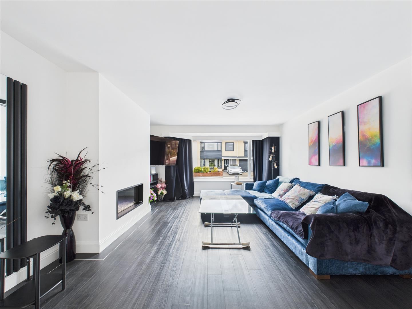 Double sliding doors lead to the living room featuring a remote controlled inset gas fire and a large bay window which overlooks the front of the property and offers views towards the seafront.