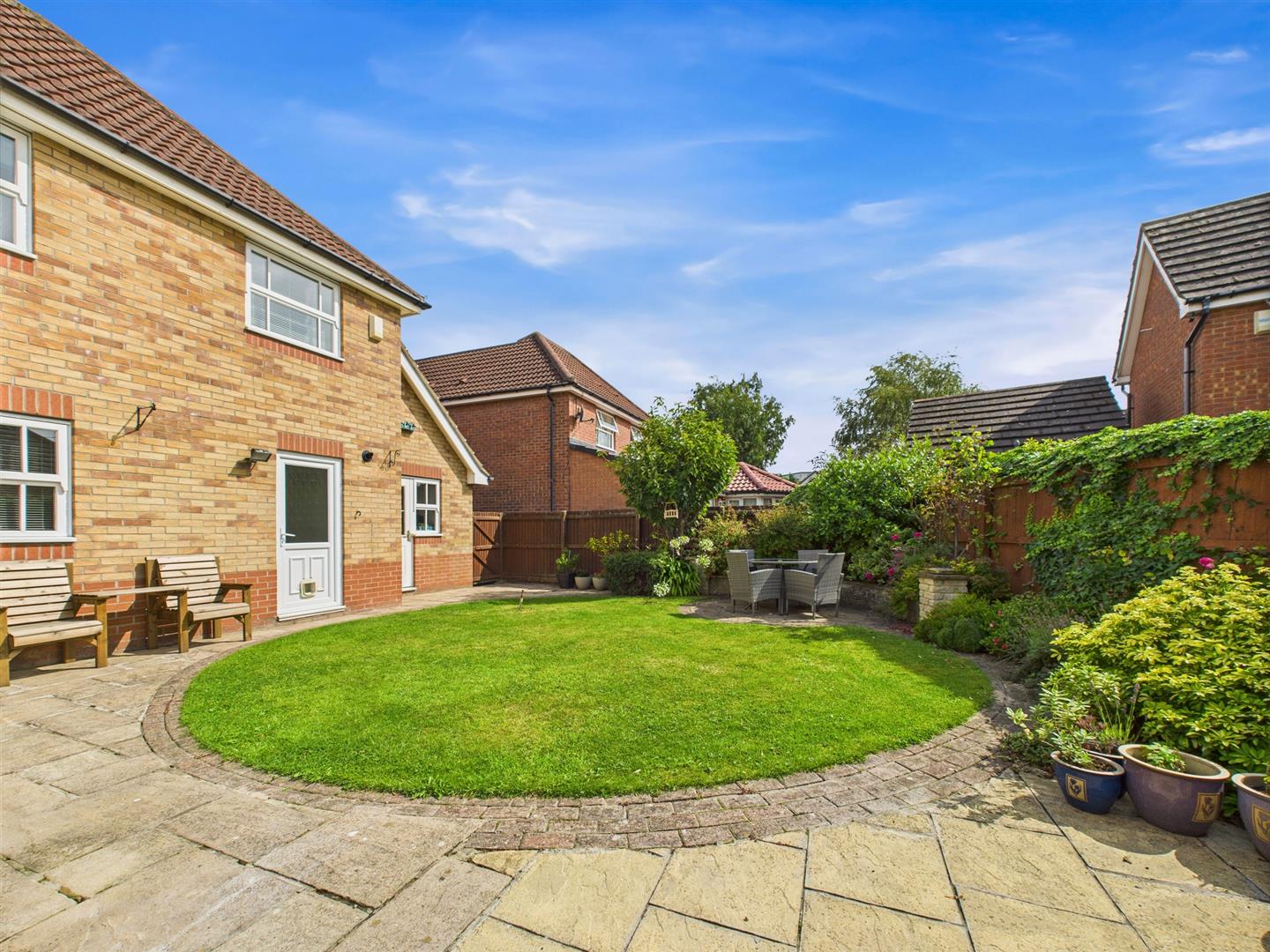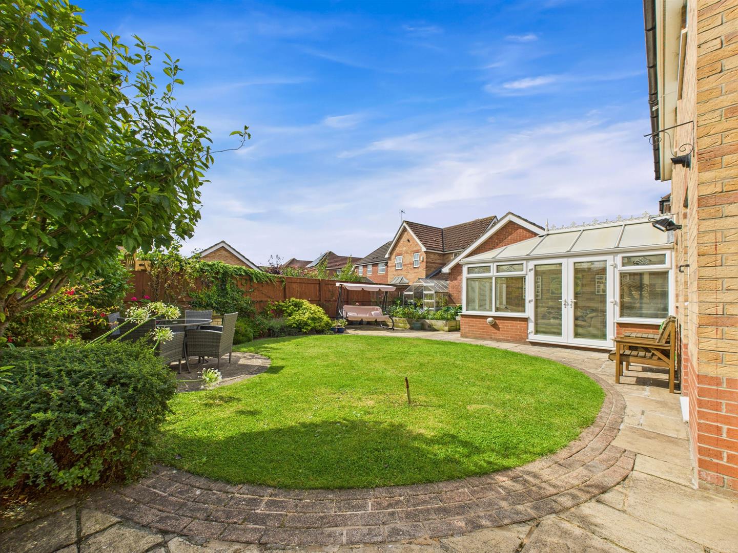 Externally to the rear is a southerly facing private garden which is well maintained, including a lawn, mature planting, raised planters, patio and side access to the front where there is driveway parking and a double garage. The garage has a large amount of storage space within the loft area which is fully boarded and accessed via a drop down ladder.