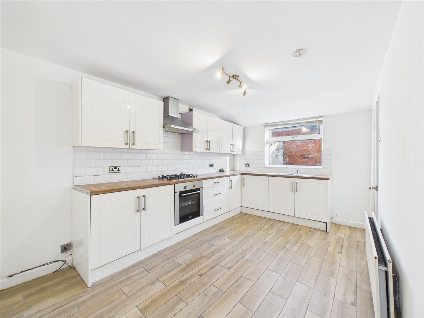 Beyond the living space, the contemporary kitchen houses several fitted high gloss wall, base and drawer units, in addition to an integral oven, hob, extractor hood and designated space for further appliances. From here, the rear lobby can be accessed, leading to both the bathroom and rear yard.