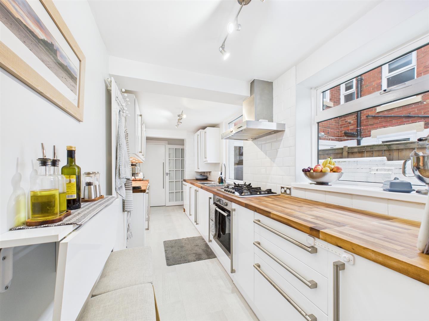Briefly comprising: Entrance vestibule to an inviting hallway with stripped floorboards flowing throughout the majority of the ground floor. The comfortable living room features a bay window overlooking the front of the property and a decorative fireplace. To the rear is a further reception room being utilised as a dining room which also features a fireplace with an open fire and double doors opening out to the rear yard. The well equipped modern kitchen has a good range of fitted wall and base units with wooden worktops. Integrated appliances include a five ring gas hob, electric oven, extractor fan, dishwasher and space for a fridge/freezer. A handy utility room provides additional storage, plumbing for a washing machine, tumble dryer, access out to the rear yard and access to the garage.
