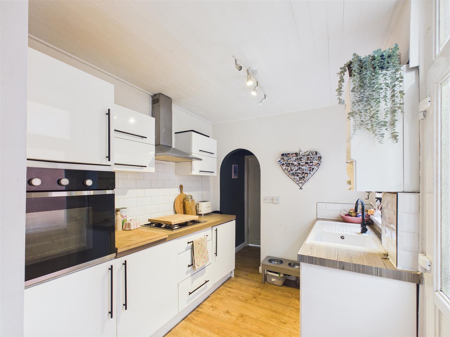 The living room offers a comfortable space, featuring high ceilings and built in alcove storage. An opening leads to the modern kitchen which has fitted wall and base units, integrated appliances include a gas hob, electric oven, extractor fan, space for a fridge and plumbing for a washing machine.
