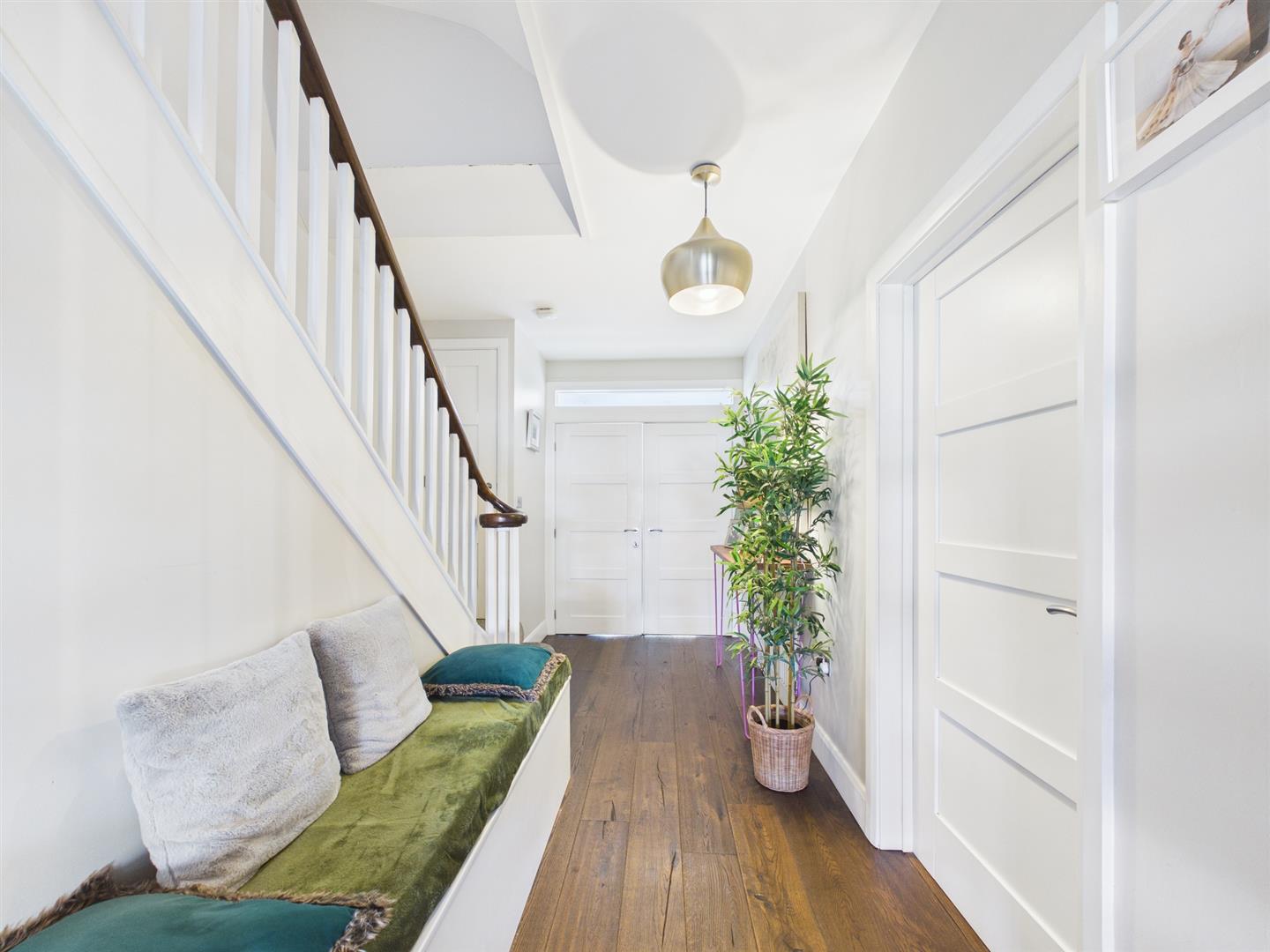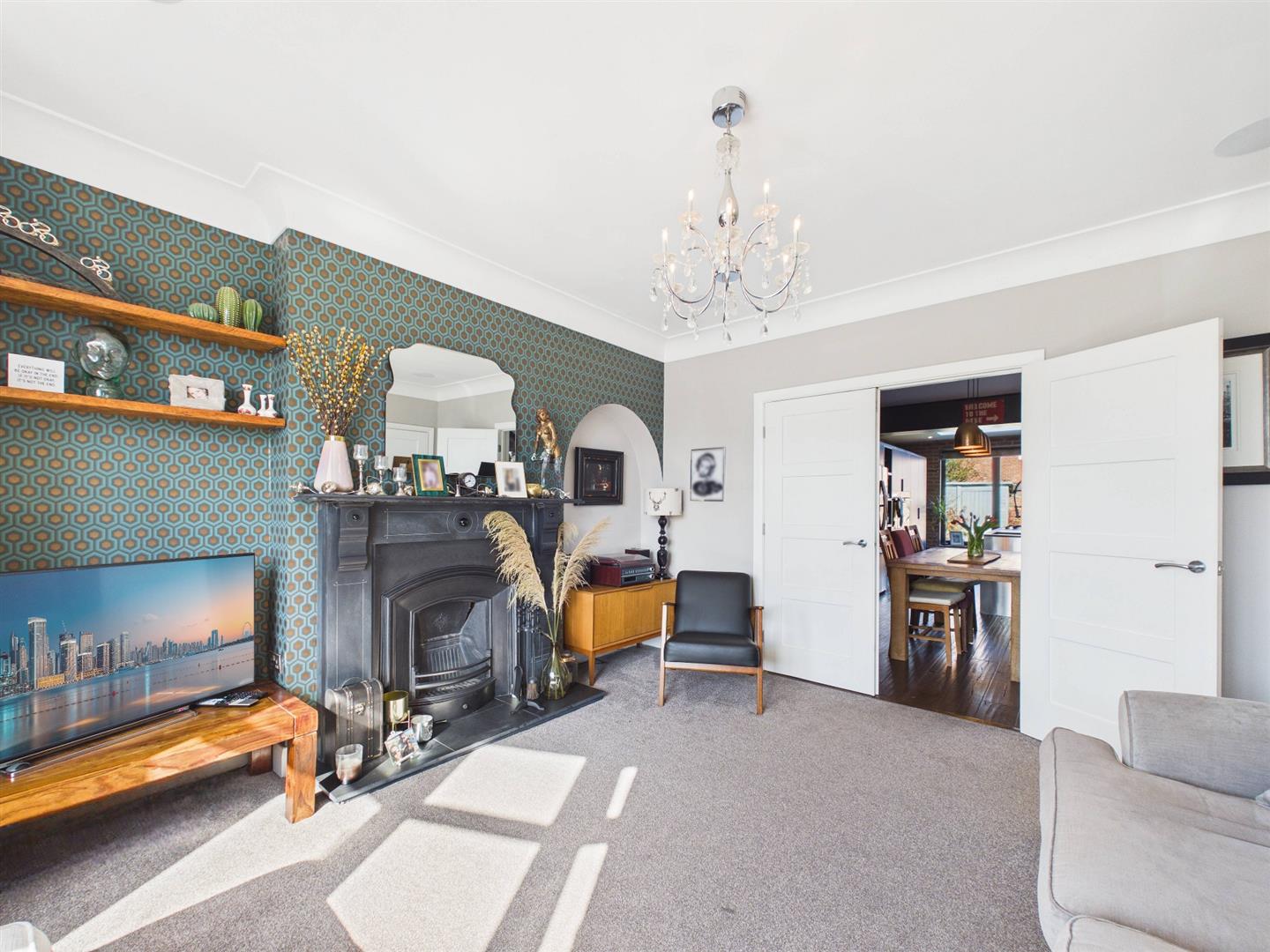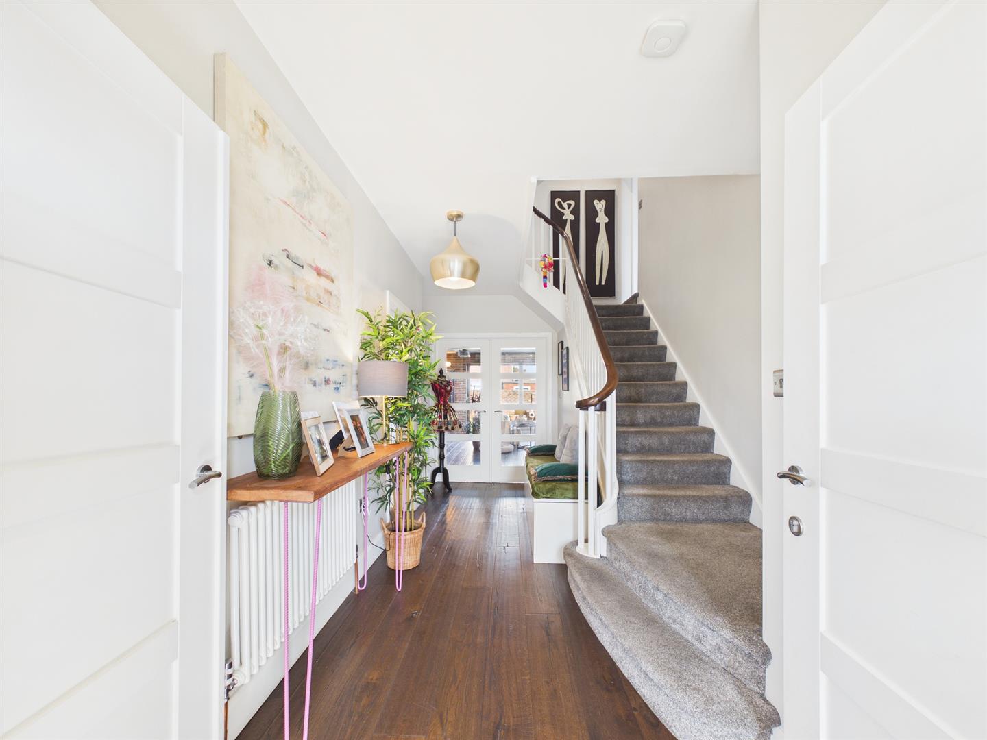 Briefly comprising: Entrance porch with double doors to a welcoming hallway leading to ground floor rooms and stairs to the first floor. To the front of the property is a bright and airy living room, boasting a bay window, fireplace and double doors to the kitchen/diner. To the rear is an impressive open plan kitchen/diner/family room with underfloor heating, offering a generous amount of space including bi-folding doors and windows opening out to the private garden. Within the kitchen area are an extensive range of modern fitted wall and base units with a central island providing storage as well as seating. Integrated appliances include two Neff ovens, five ring gas hob, downdraft extractor, dishwasher and space for an American style fridge/freezer.