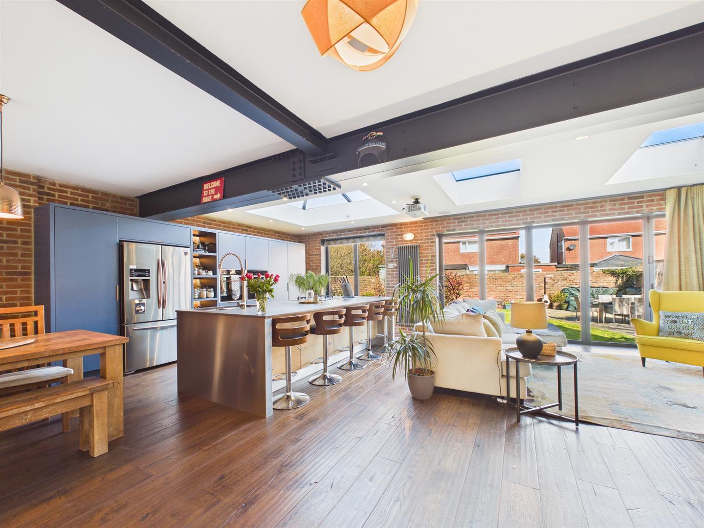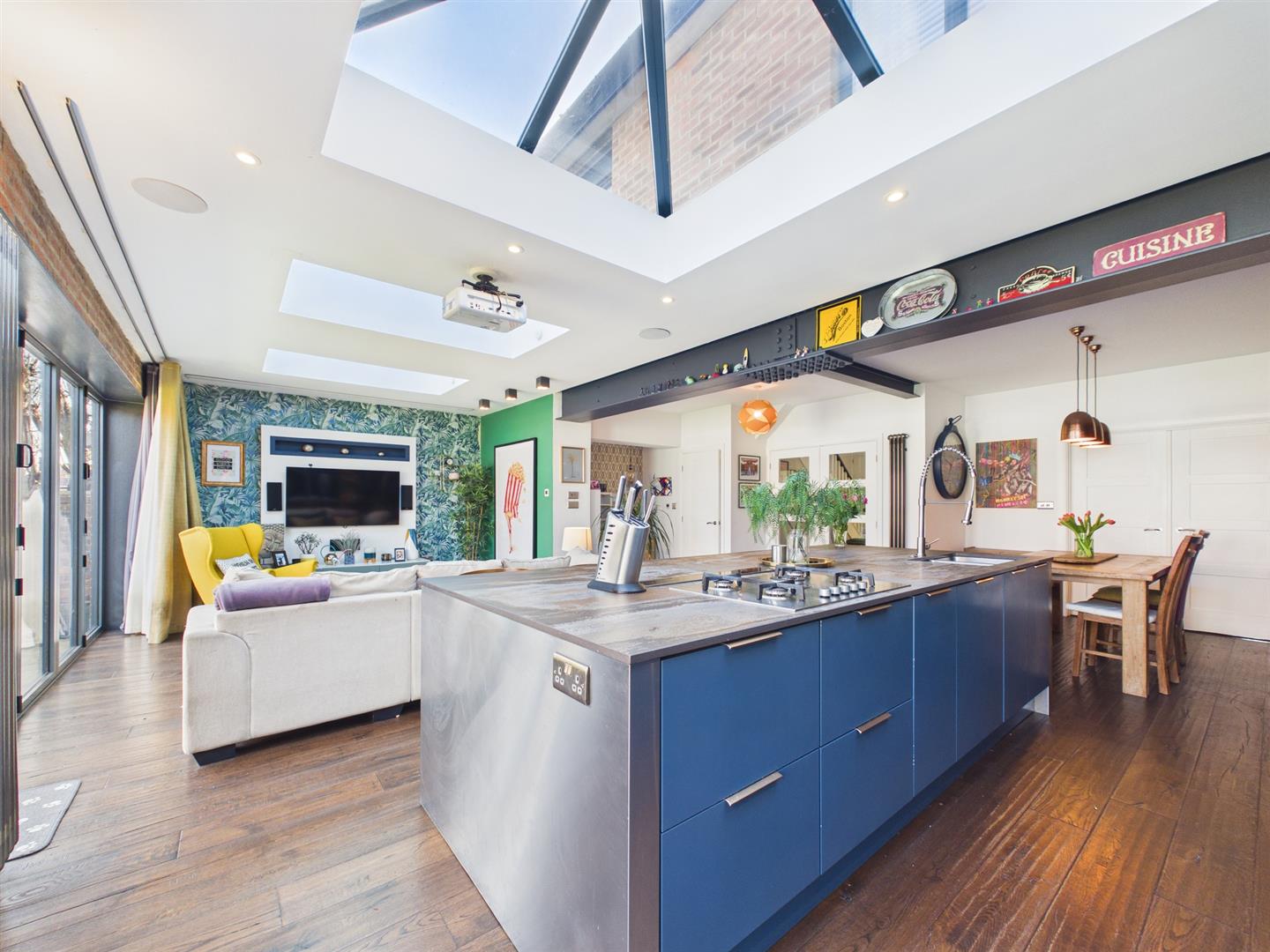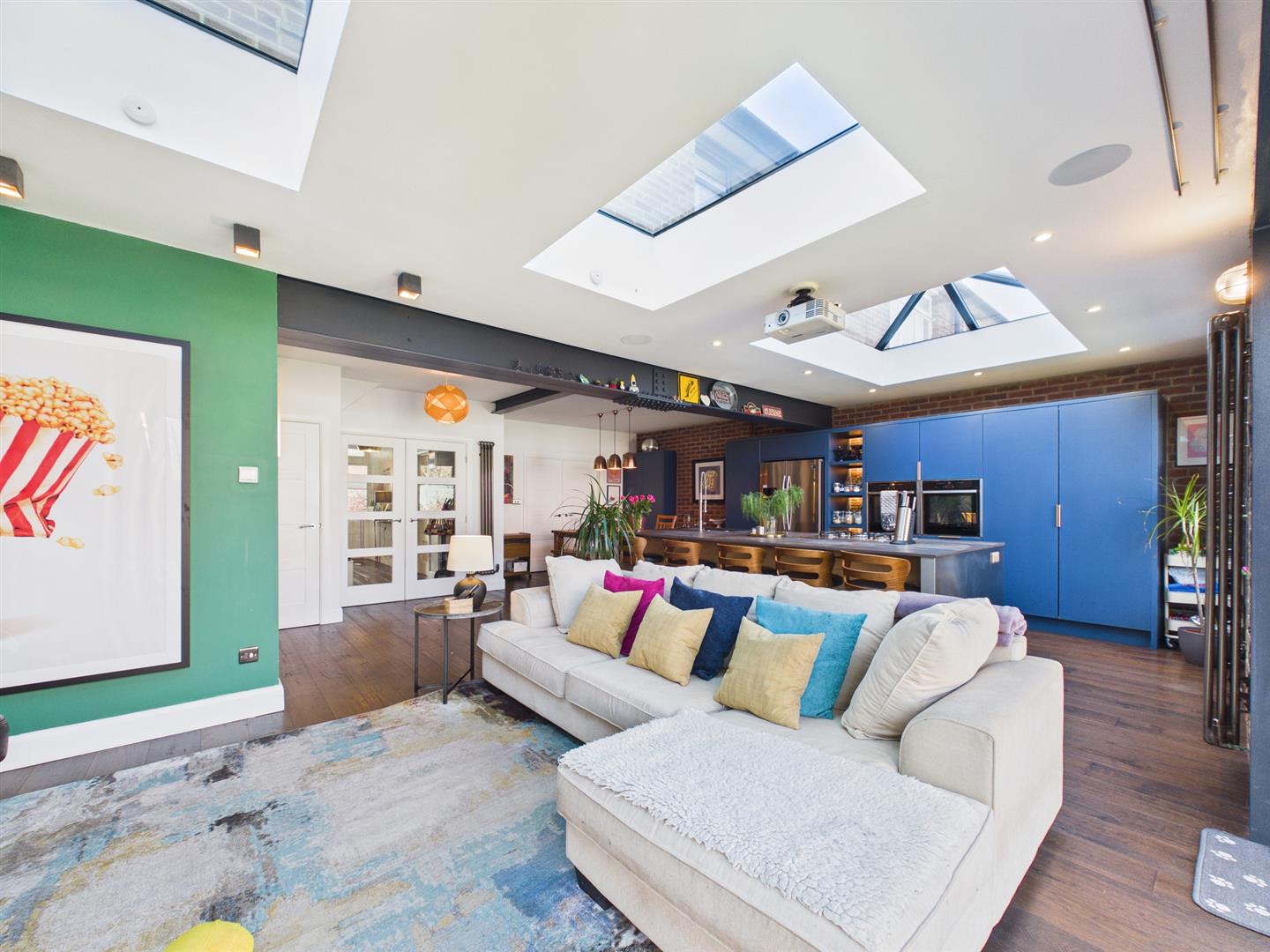 Briefly comprising: Entrance porch with double doors to a welcoming hallway leading to ground floor rooms and stairs to the first floor. To the front of the property is a bright and airy living room, boasting a bay window, fireplace and double doors to the kitchen/diner. To the rear is an impressive open plan kitchen/diner/family room with underfloor heating, offering a generous amount of space including bi-folding doors and windows opening out to the private garden. Within the kitchen area are an extensive range of modern fitted wall and base units with a central island providing storage as well as seating. Integrated appliances include two Neff ovens, five ring gas hob, downdraft extractor, dishwasher and space for an American style fridge/freezer.