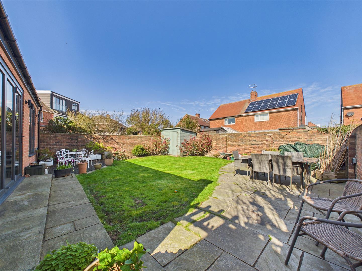Externally to the rear is a well proportioned private walled garden, laid to lawn with a patio and timber shed. There is side access to the front where there is driveway parking for multiple cars and a garage with a remote electric door.