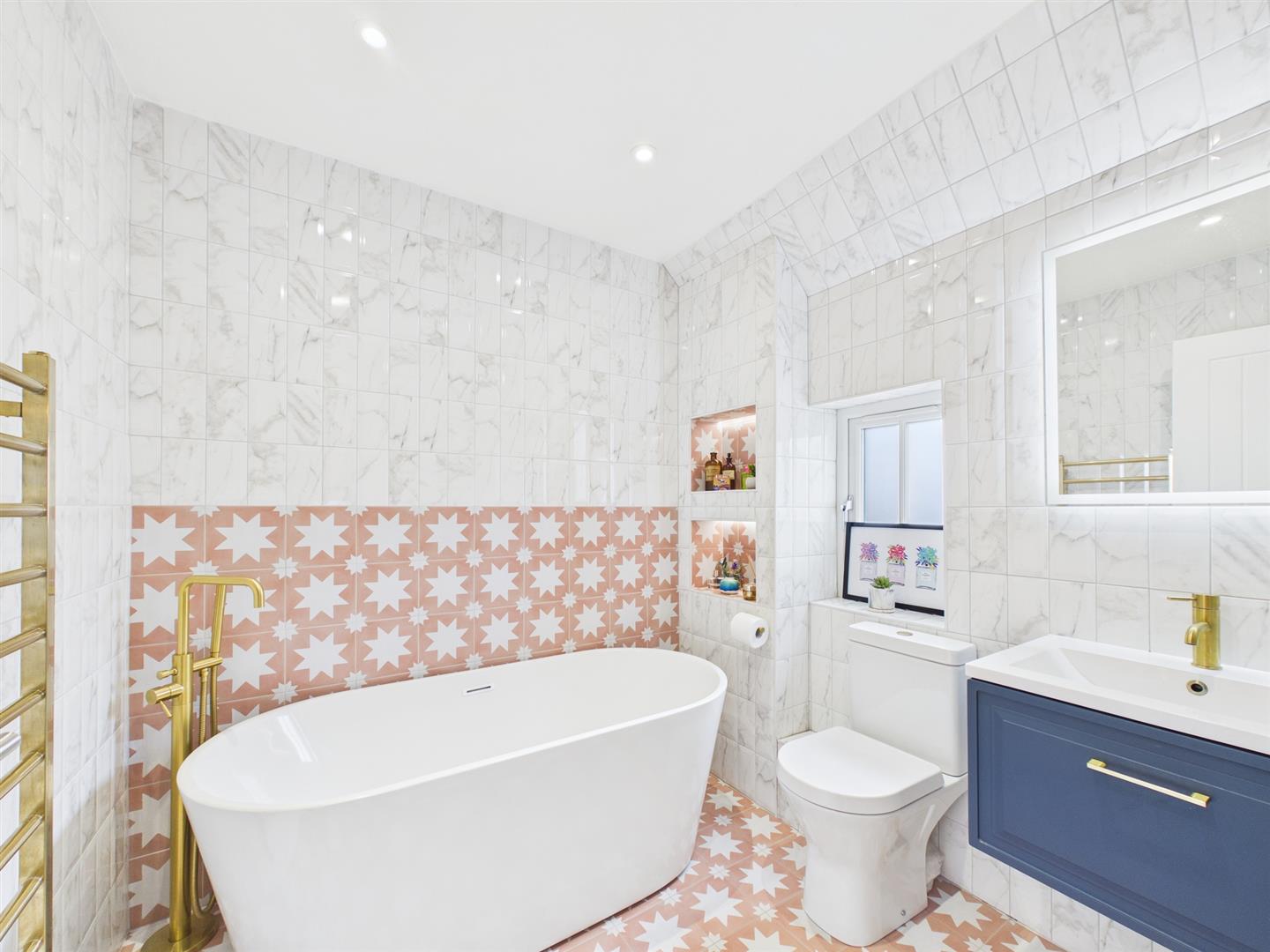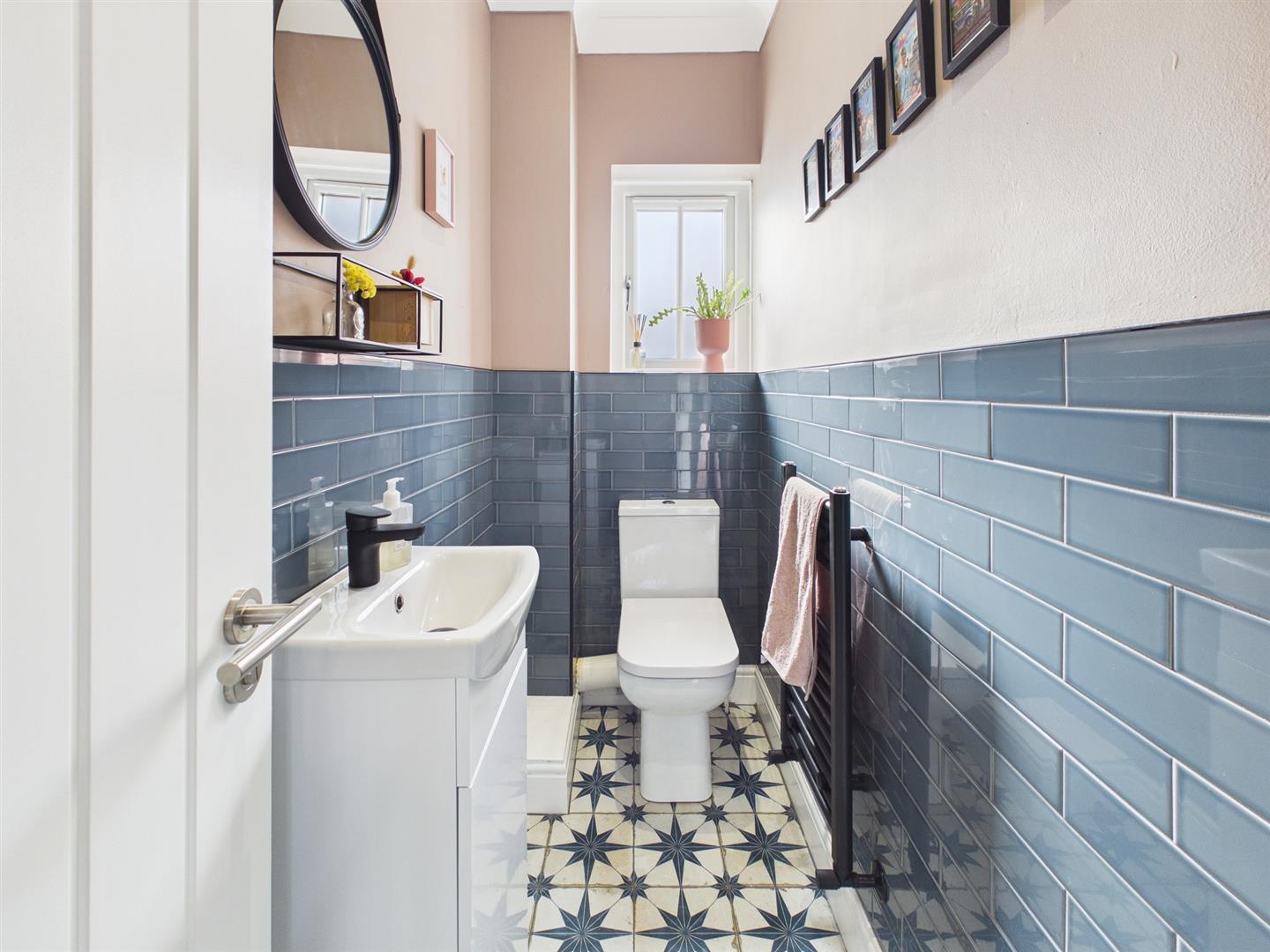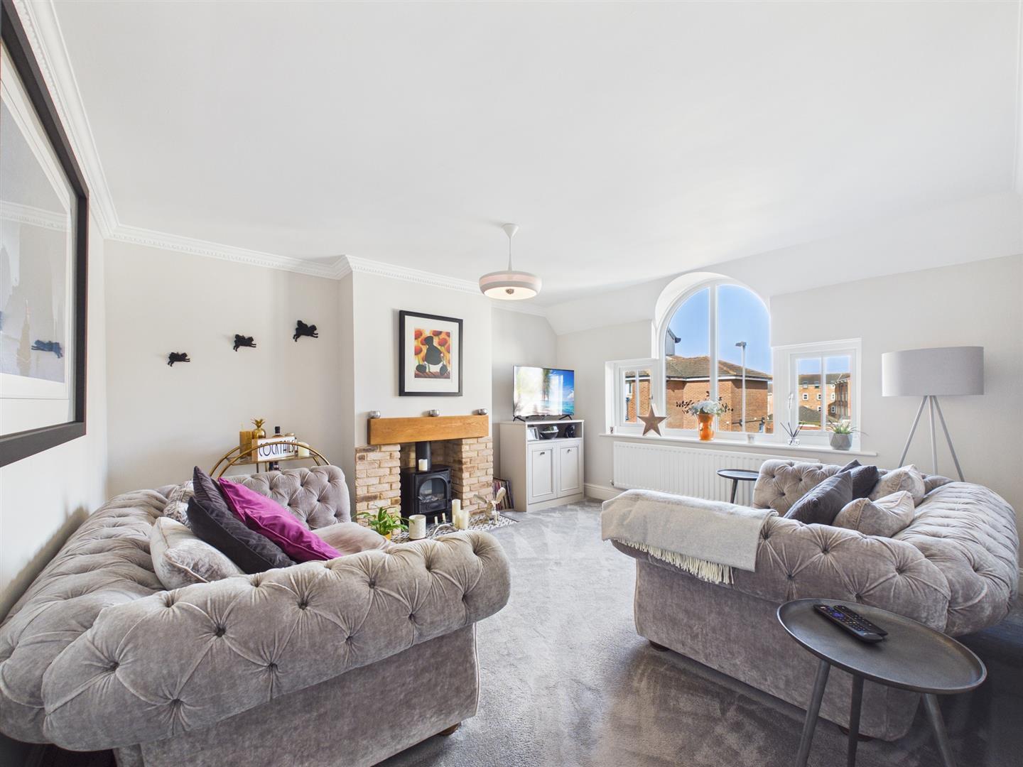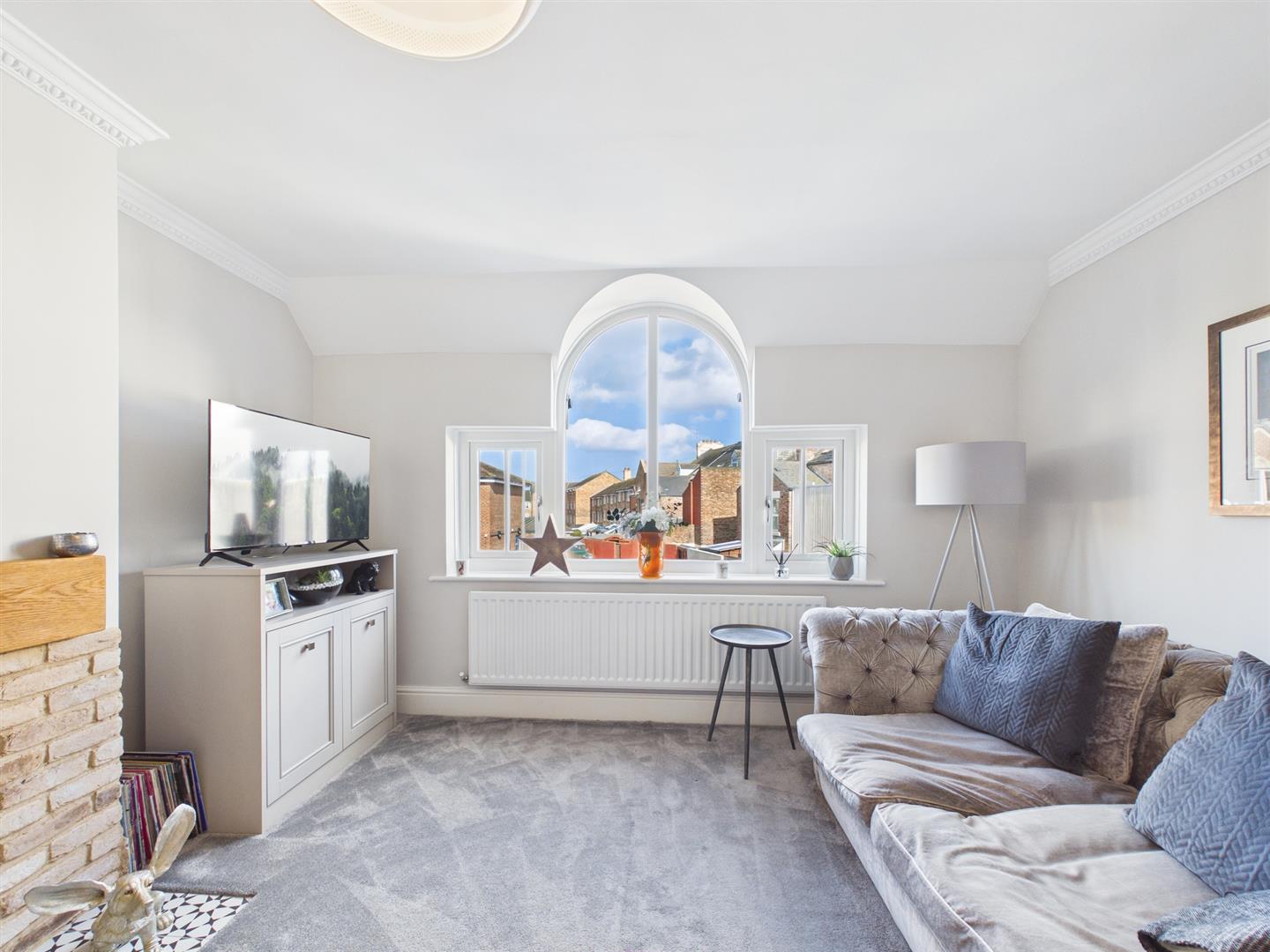 To the first floor is a stunning living room, featuring a large picture window offering side views towards the River Tyne and a fireplace housing a log effect gas stove. There are three bedrooms and bathroom on this floor. Two of the bedrooms are large doubles in size, one of which has fitted wardrobes and the other benefits from an en-suite shower room. The third bedroom is currently being utilised as a dressing room as it has quality fitted wardrobes. The contemporary bathroom is tastefully designed comprising a free standing bath, separate walk in shower, hand basin within a fitted vanity unit, W.C. and heated towel rail.