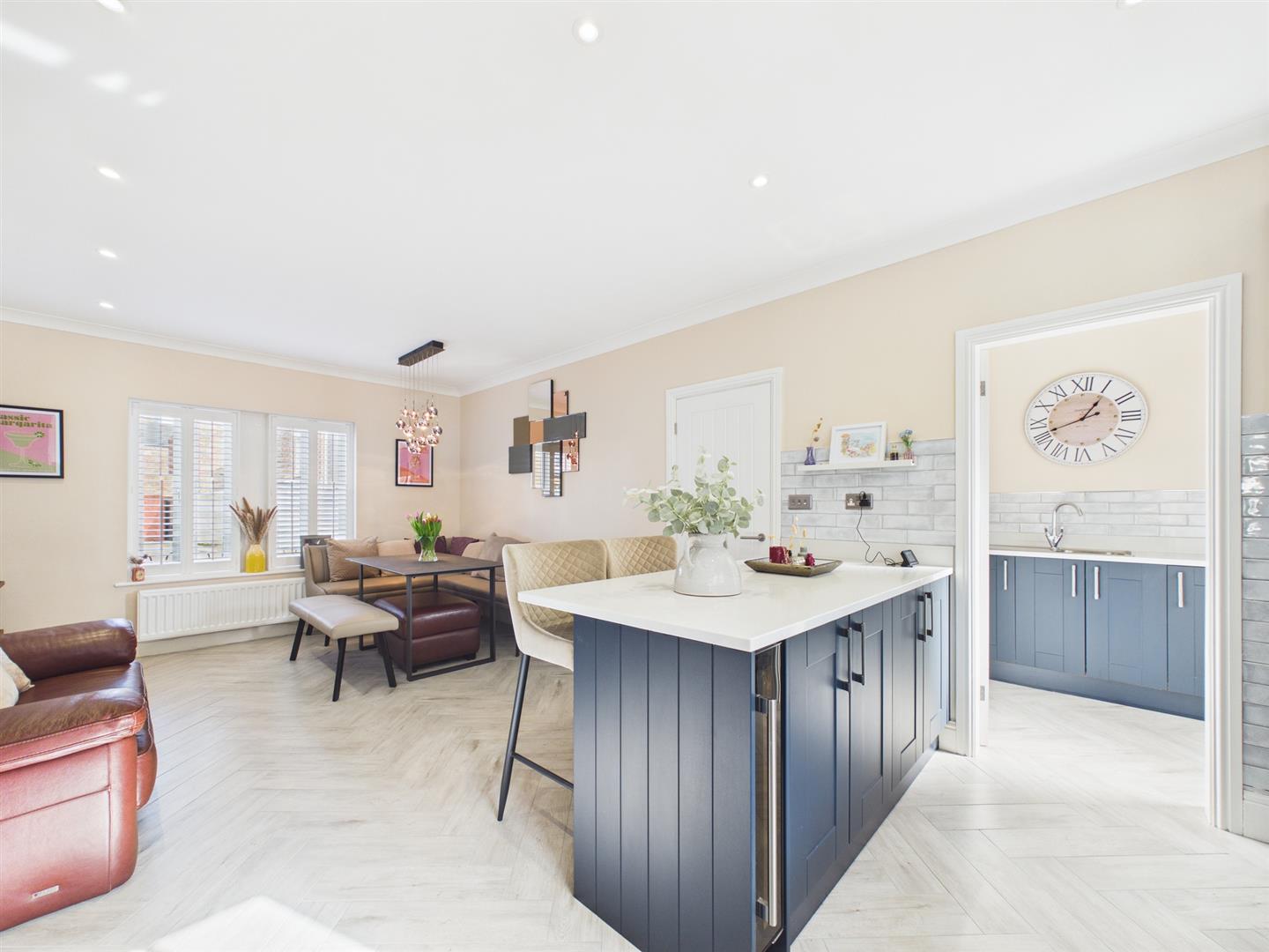 Briefly comprising: Entrance to an inviting hallway giving access to all ground floor rooms, stairs leading to the first floor and an understairs cupboard. The well equipped kitchen/diner/family room offers a sociable space with a dual aspect. A stylish range of fitted wall and base units provide storage with quartz worktops, Bosch integrated appliances include a five ring gas hob, double oven, extractor hood, dishwasher, fridge freezer and wine cooler. A handy utility room provides additional storage, sink, plumbing for a washing machine and access out to the rear garden. A separate W.C. is located off the main hallway as well as a door to the garage.
