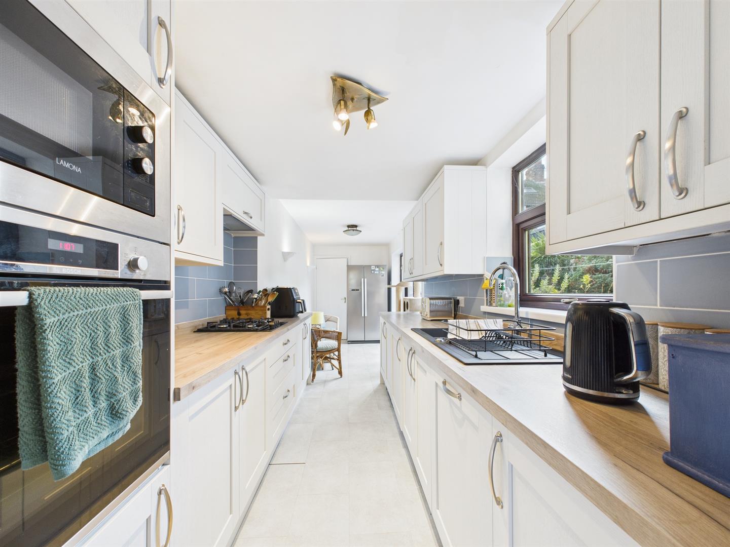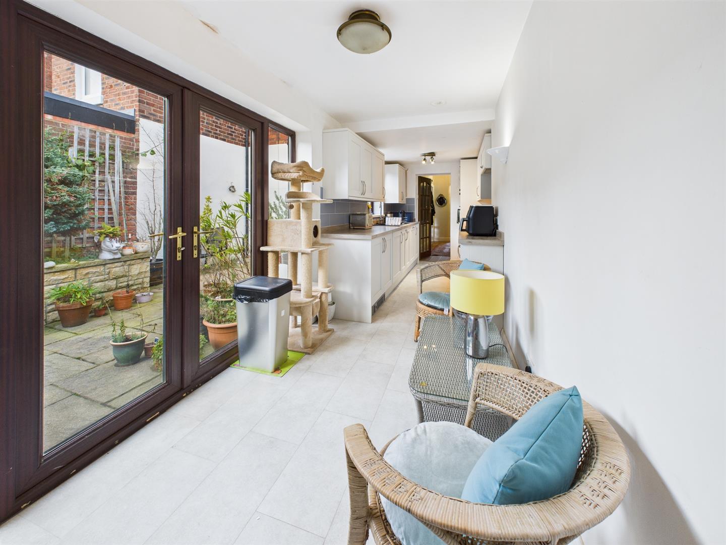 The modern fitted kitchen provides ample storage, space for a dining table and a full range of integrated appliances including oven, microwave, dishwasher, washing machine, gas hob and extractor fan. Double patio doors open out onto the private rear yard there is also a door leading to a useful utility room.