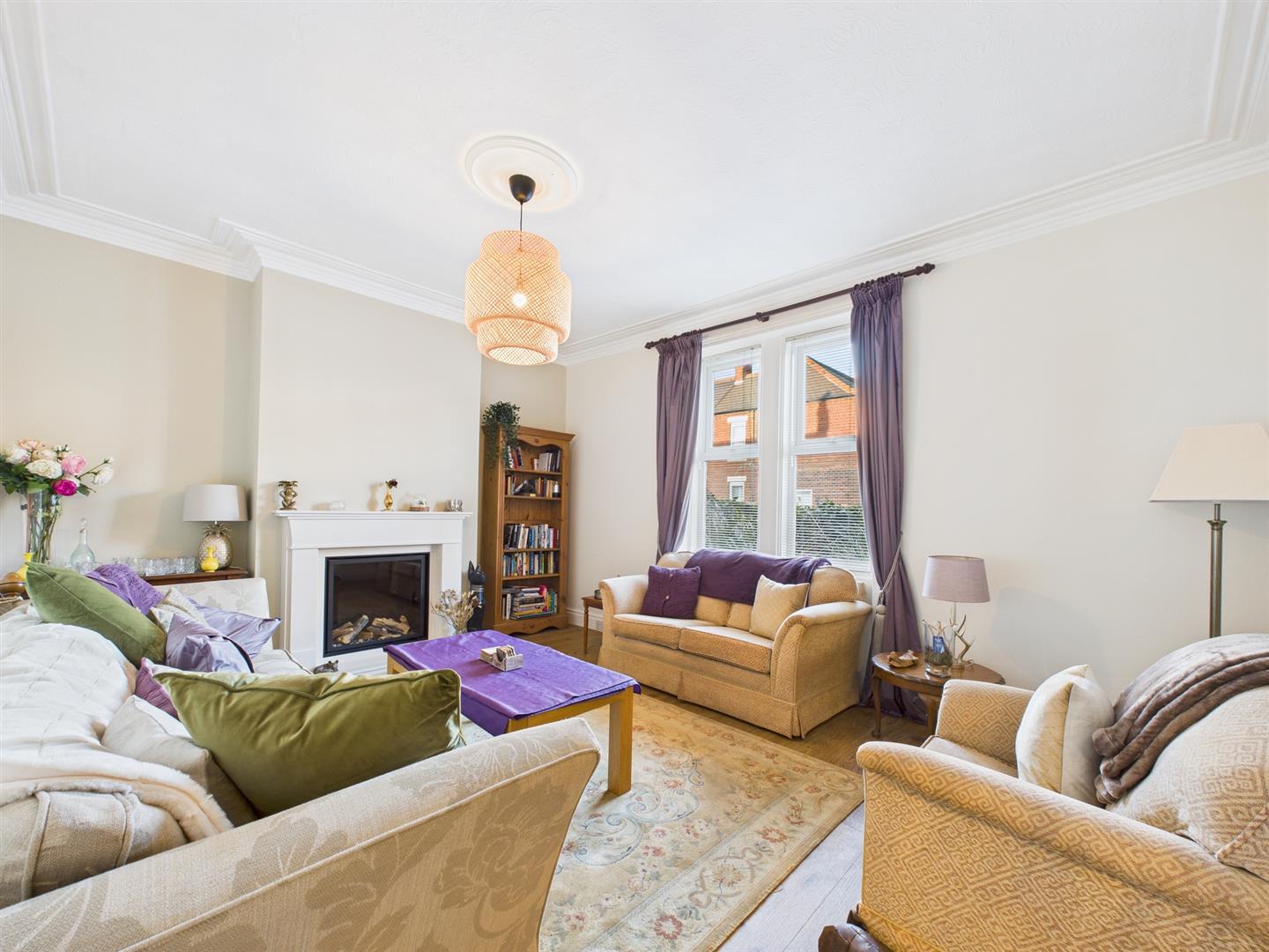 The generous front lounge is a bright room featuring double windows, decorative coving, a ceiling rose and a feature fireplace with a gas fire.