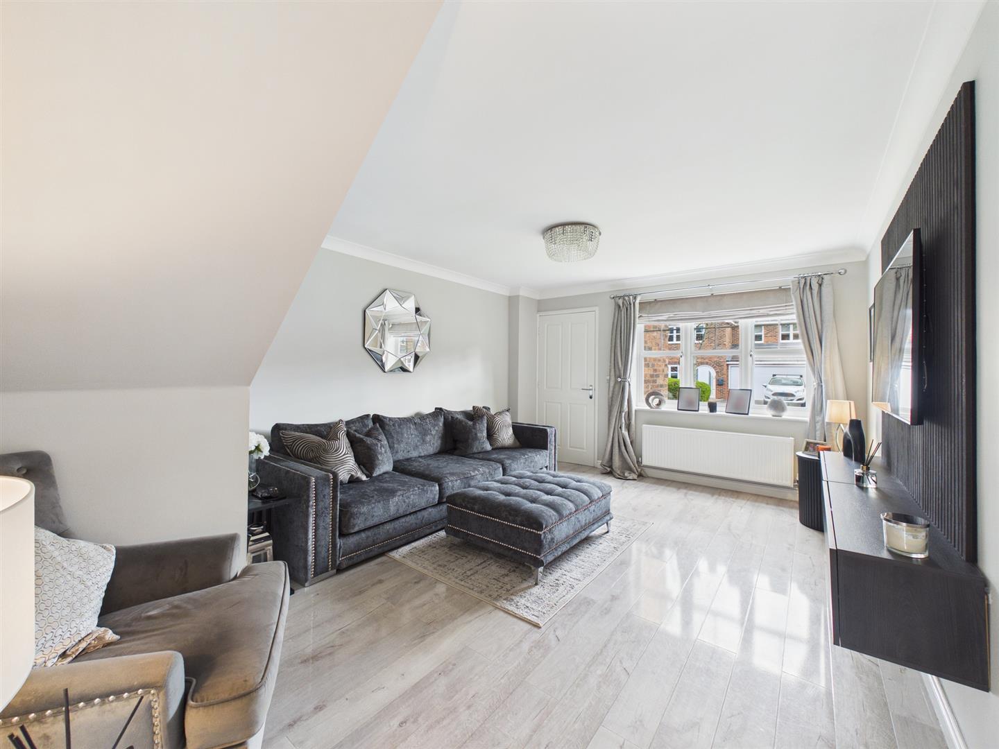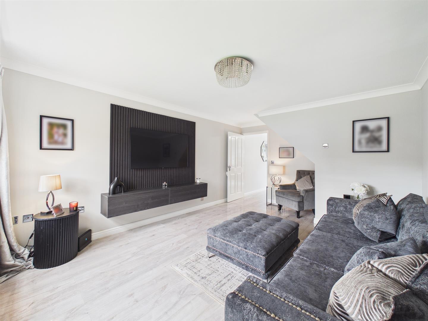 Overlooking the front of the property, the amply sized living space is light and inviting, furnished with wall panelling and presenting a modern design, connecting directly to the secondary reception space.