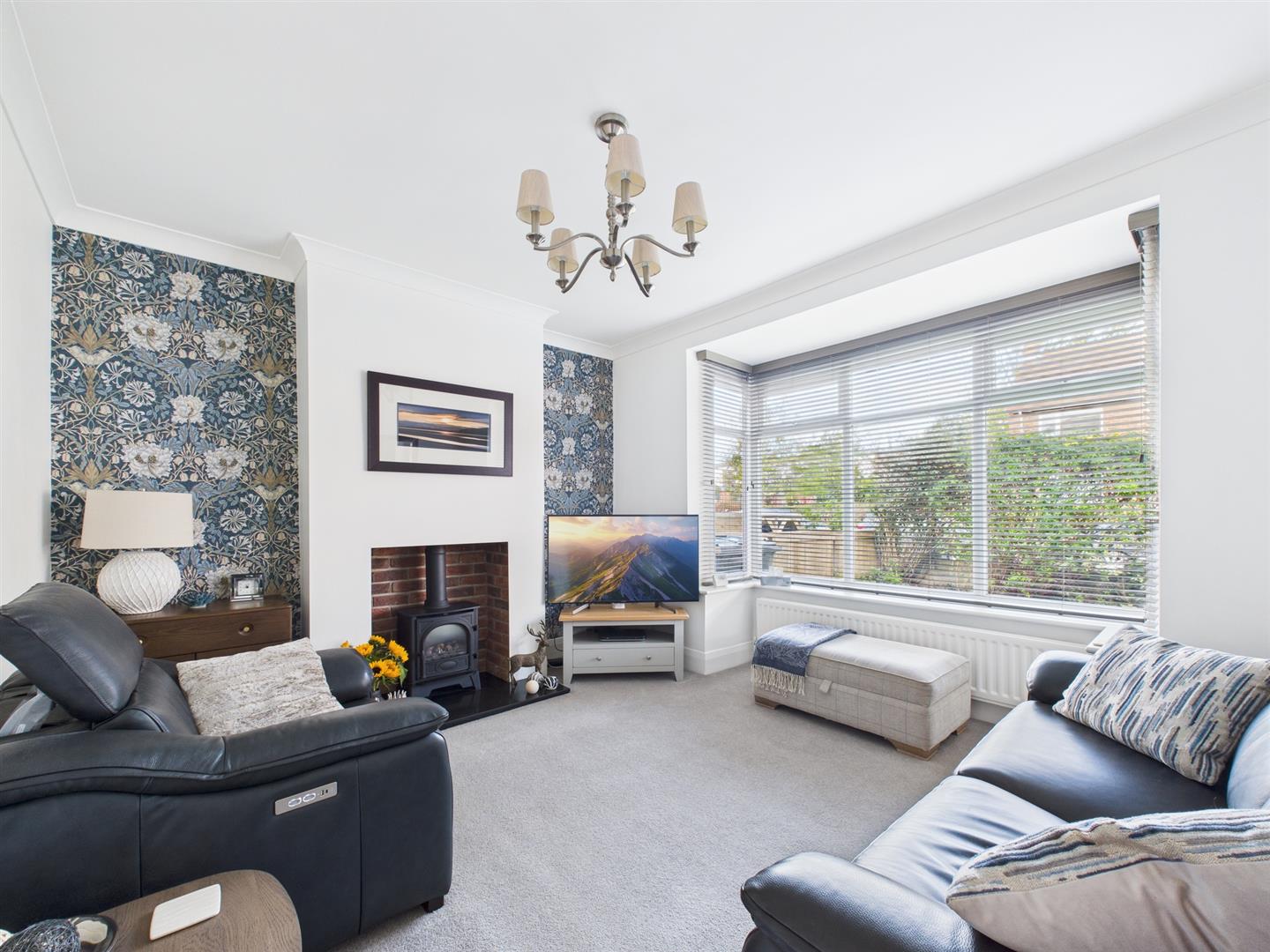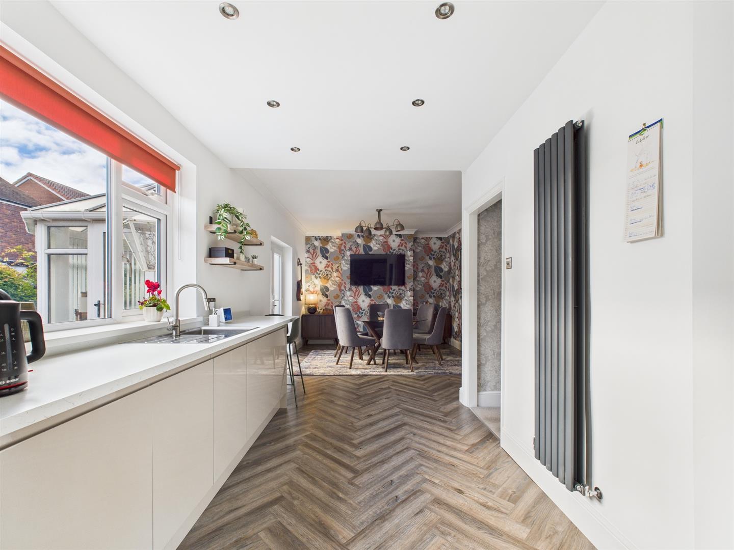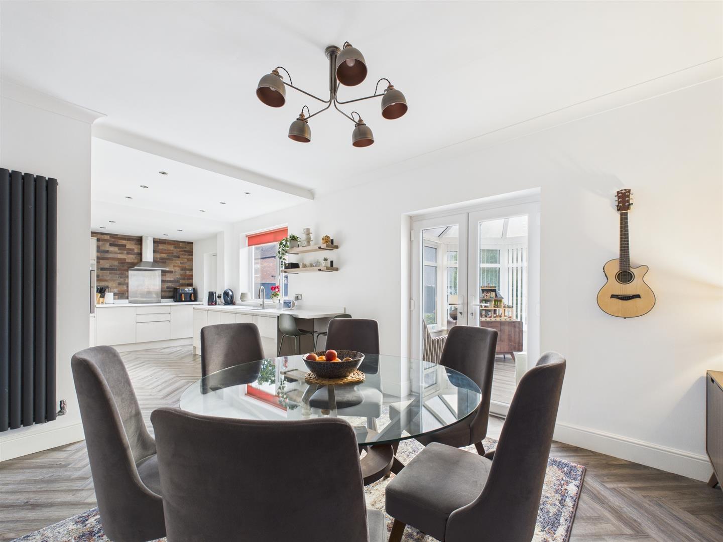 Briefly comprising: Entrance porch to an inviting hallway where there is under stairs storage. Overlooking the front of the property is the living room with a box bay window and an attractive fireplace housing a gas fire. To the rear is a well equipped open plan kitchen/diner, benefitting from modern wall and base units including an integrated induction hob, double oven, extractor fan, fridge and dishwasher. Double doors from the dining area lead to the conservatory which offers views over the garden as well as access out to a patio. A handy utility room provides additional storage, plumbing for a washing machine, tumble dryer and a door to the garage.