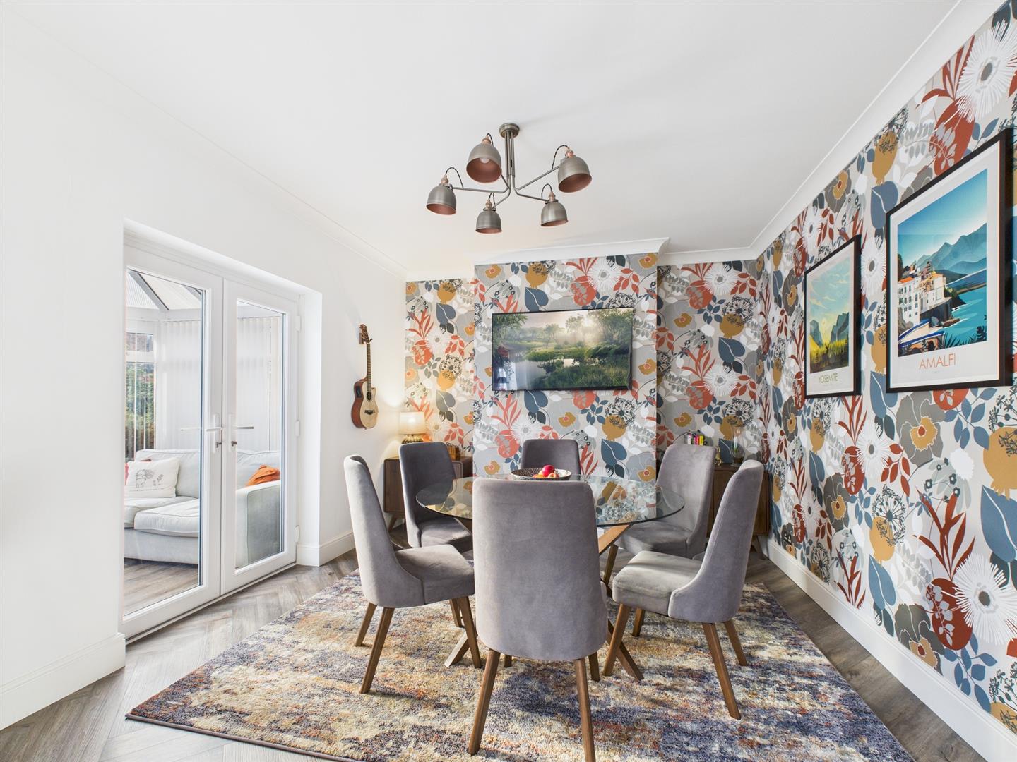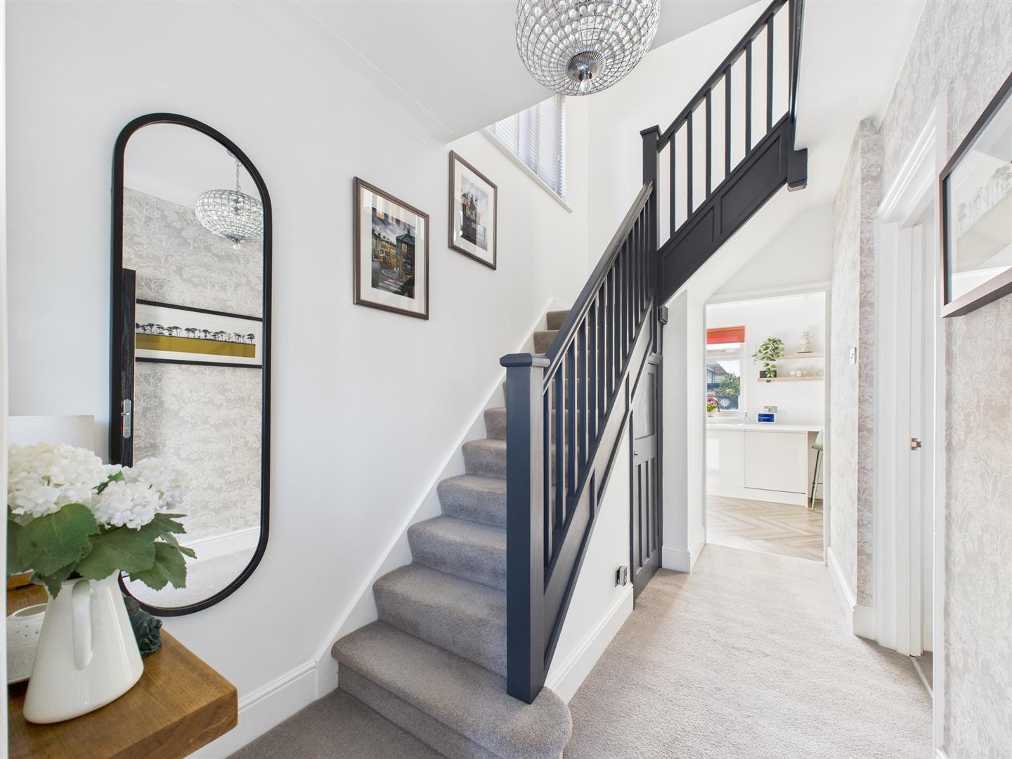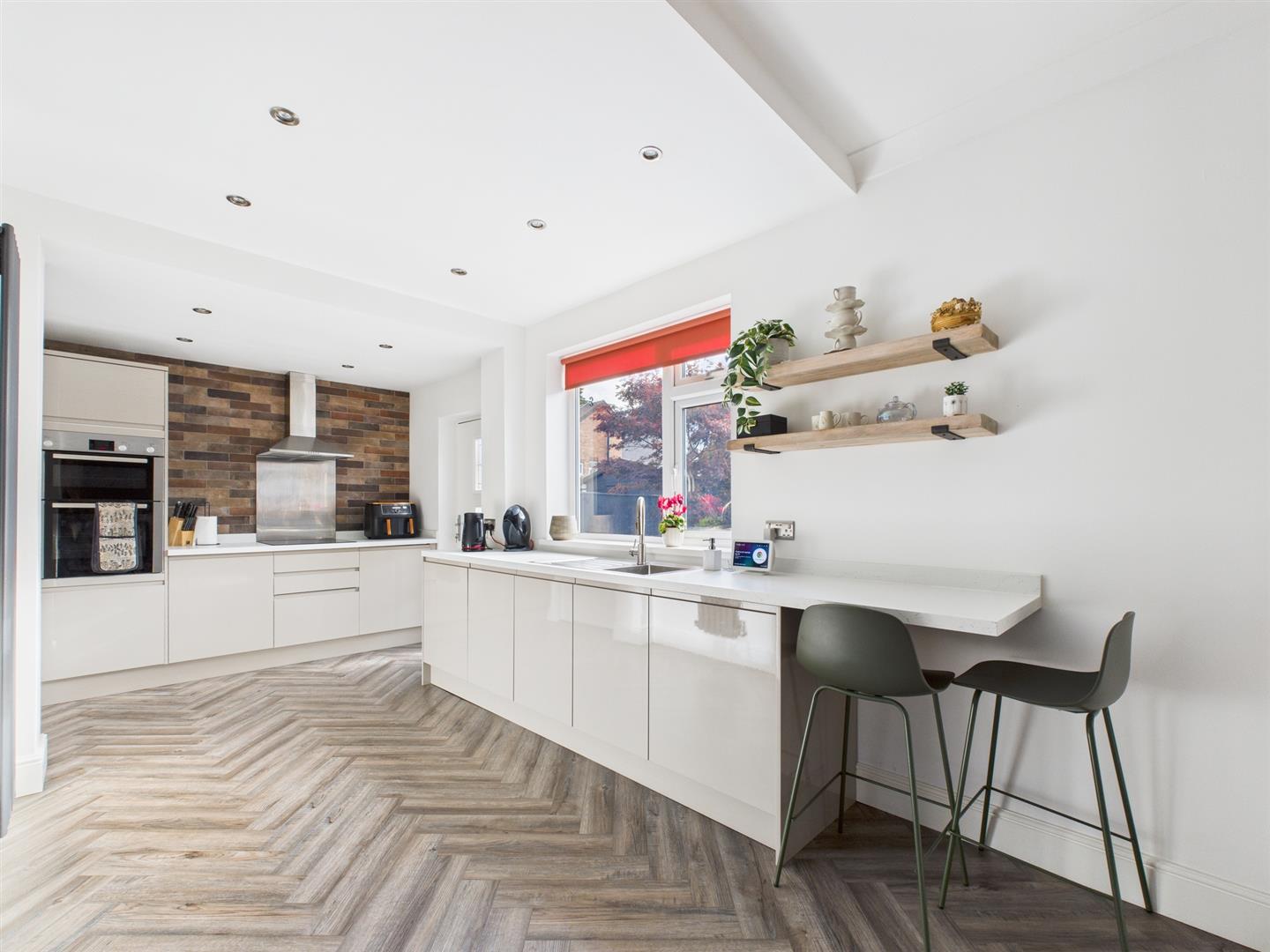 Briefly comprising: Entrance porch to an inviting hallway where there is under stairs storage. Overlooking the front of the property is the living room with a box bay window and an attractive fireplace housing a gas fire. To the rear is a well equipped open plan kitchen/diner, benefitting from modern wall and base units including an integrated induction hob, double oven, extractor fan, fridge and dishwasher. Double doors from the dining area lead to the conservatory which offers views over the garden as well as access out to a patio. A handy utility room provides additional storage, plumbing for a washing machine, tumble dryer and a door to the garage.