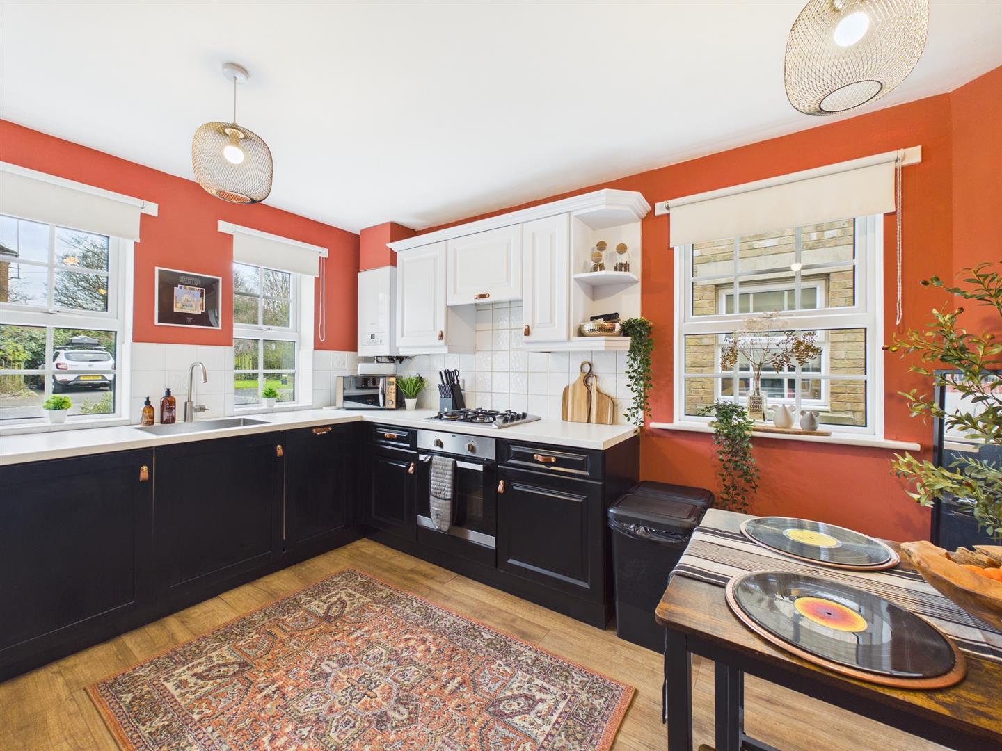 Initially, the breakfasting kitchen is positioned to the left, overlooking the the front of the property. Presenting tasteful decor, the kitchen itself offers two tone cabinetry, incorporating an integral oven, hob, extractor, dishwasher and washing machine, in addition to designated space for further appliances and a breakfast table.