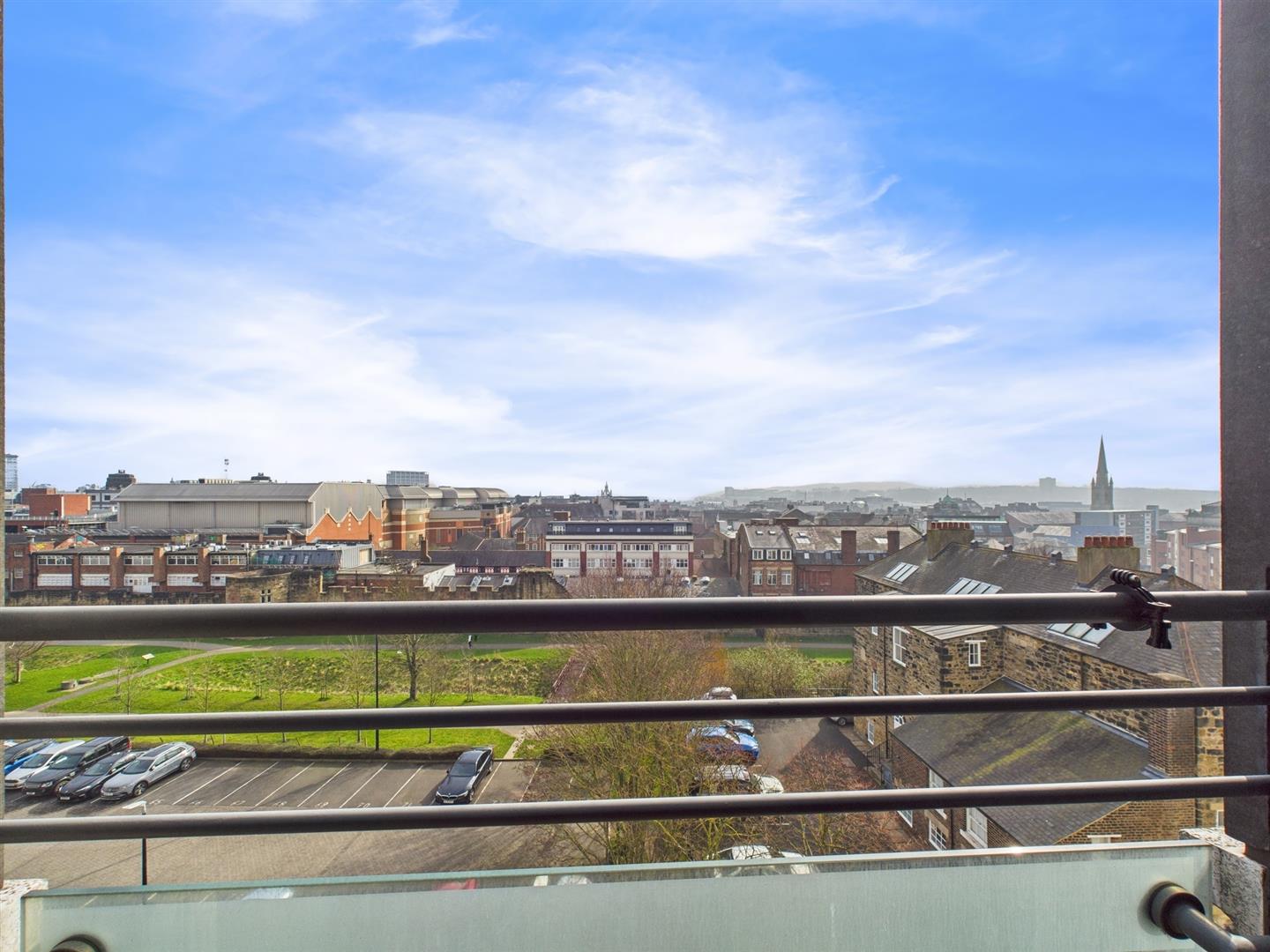 To the right, the open plan kitchen/living area sits offering a Juliette balcony to enjoy open aspect views of Newcastle City Centre. The kitchen itself benefits from several fitted wall, base and drawer units, whilst integral appliances include: eye level oven, floating extractor hood, electric hob, fridge/freezer and washing machine. A convenient breakfast bar provides dining space.