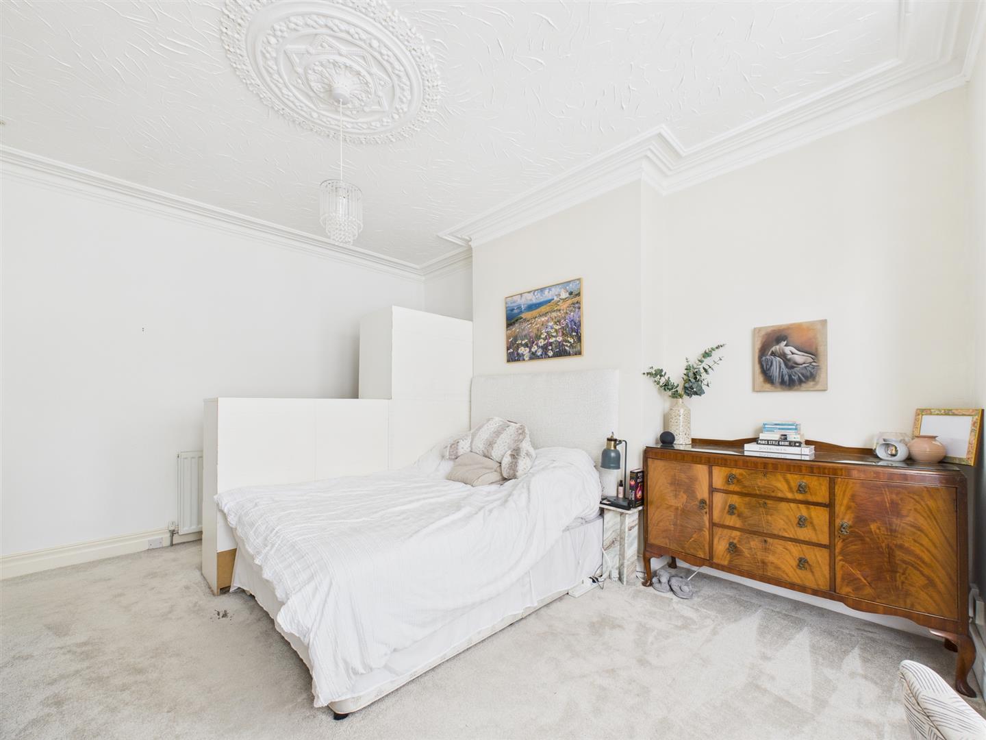 There are two bedrooms, one in particular is very generous in size featuring high ceilings, decorative coving, ceiling rose and a large bay window to the front.