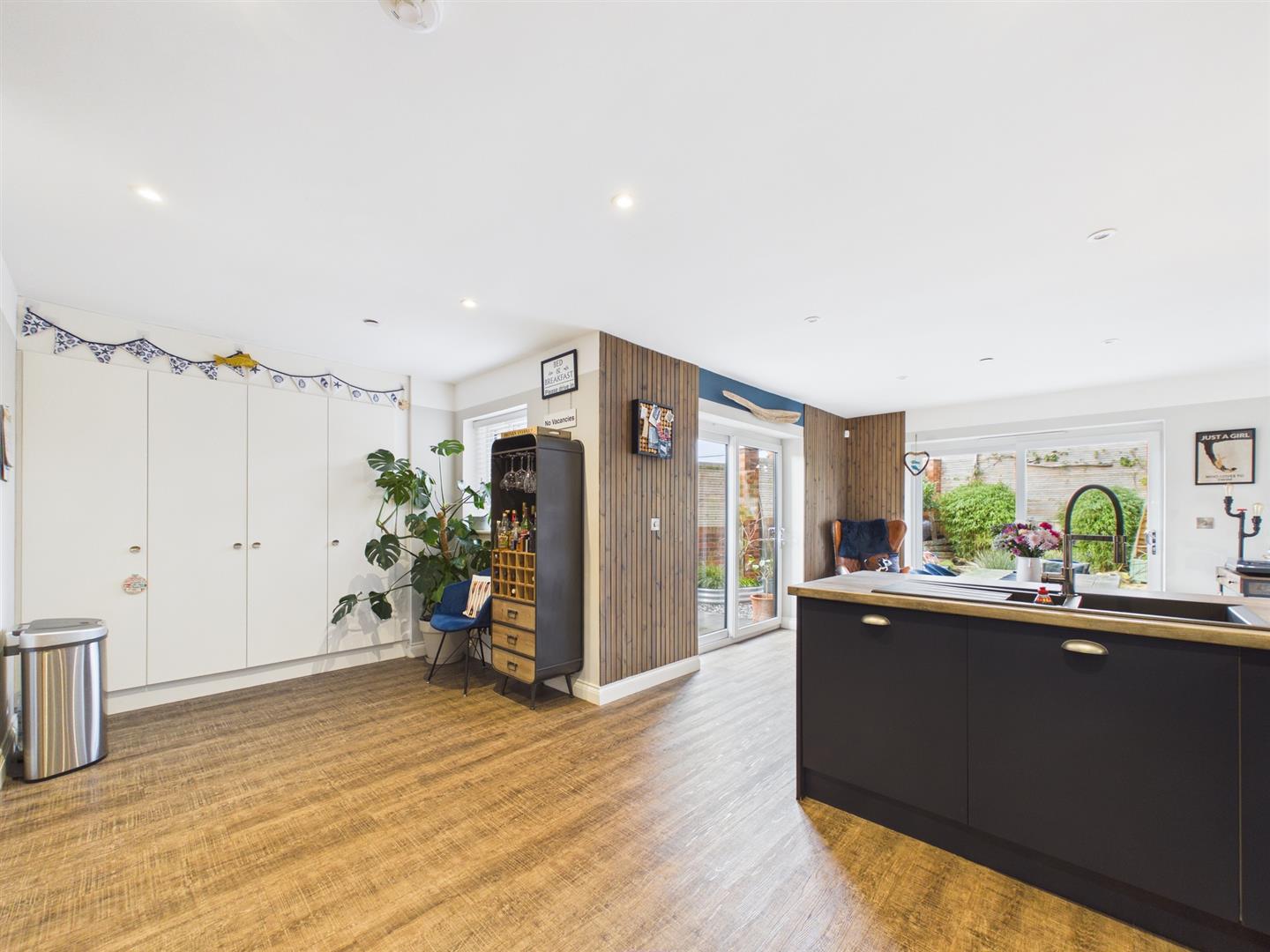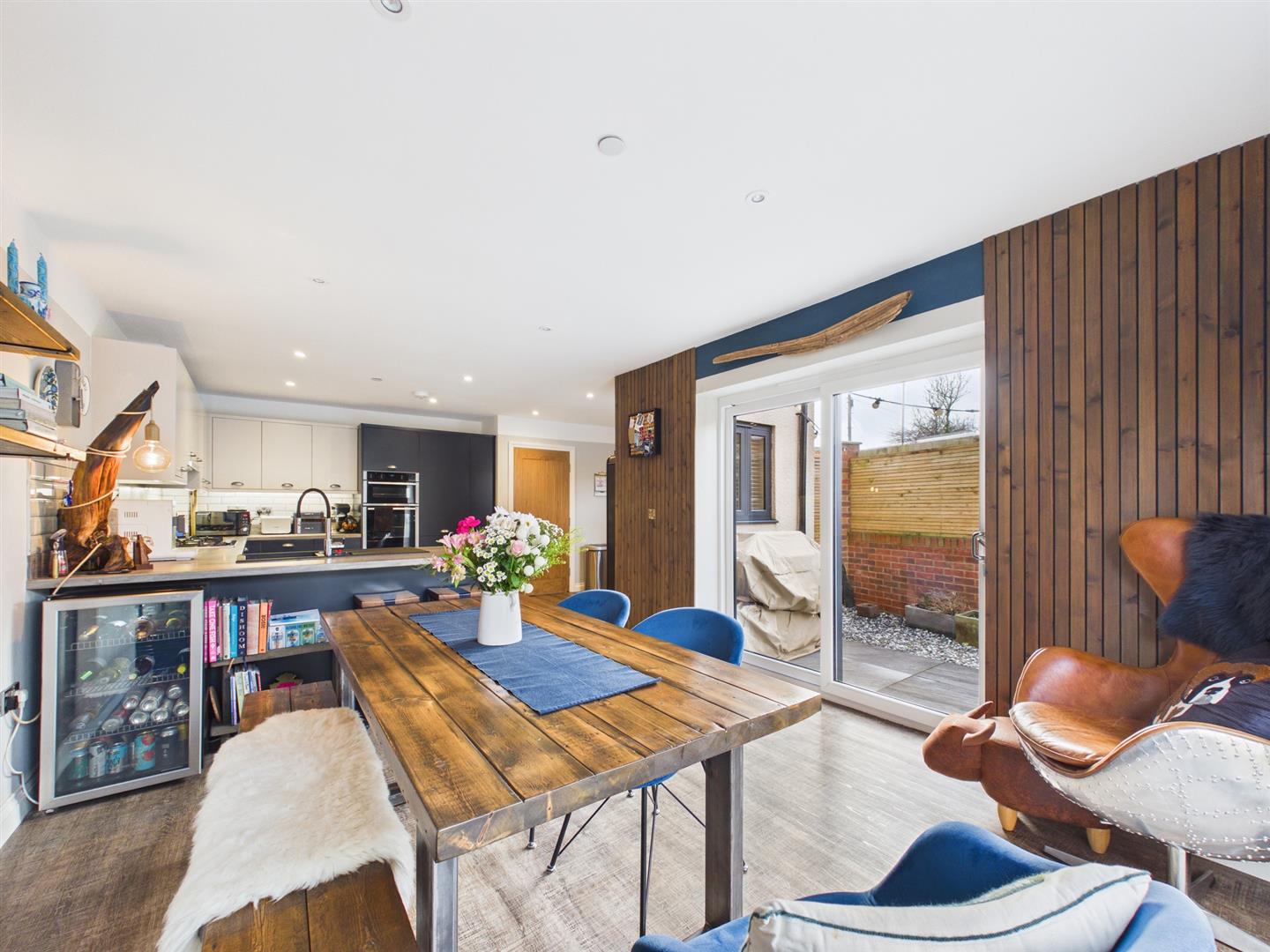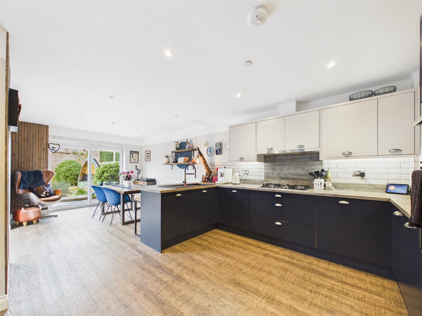 Briefly comprising: Entrance vestibule leading to a welcoming hallway. To the rear of the property is a beautifully presented open plan kitchen/diner, benefitting from two sets of sliding patio doors opening out to the private garden. The well equipped kitchen has fitted wall and base units, integrated appliances include a five ring gas hob, Neff double oven, extractor fan, fridge/freezer, dishwasher and washing machine. Further built in cupboards provide additional storage. A separate W.C. is accessed from the hallway as well as access to the garage.