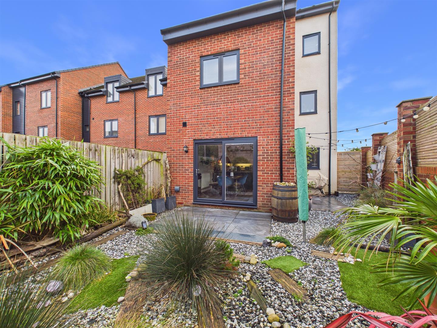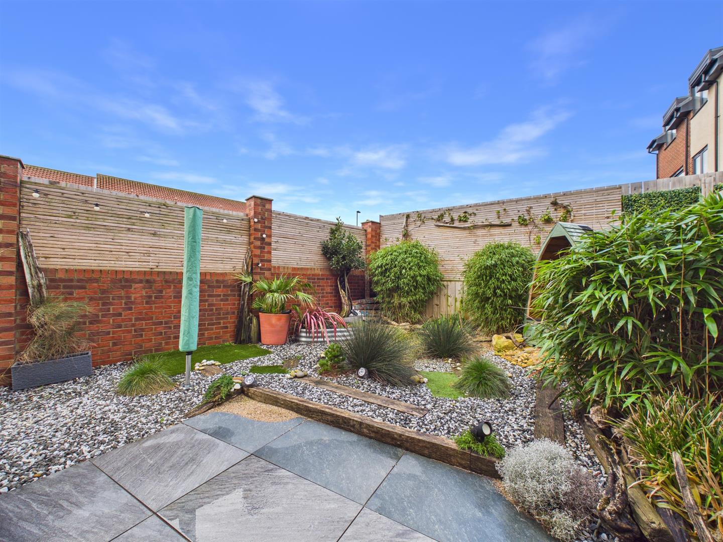Externally to the rear is a private landscaped garden, paved patios offer seating with attractive planting. There is side access to the front where there is a double driveway and garage.