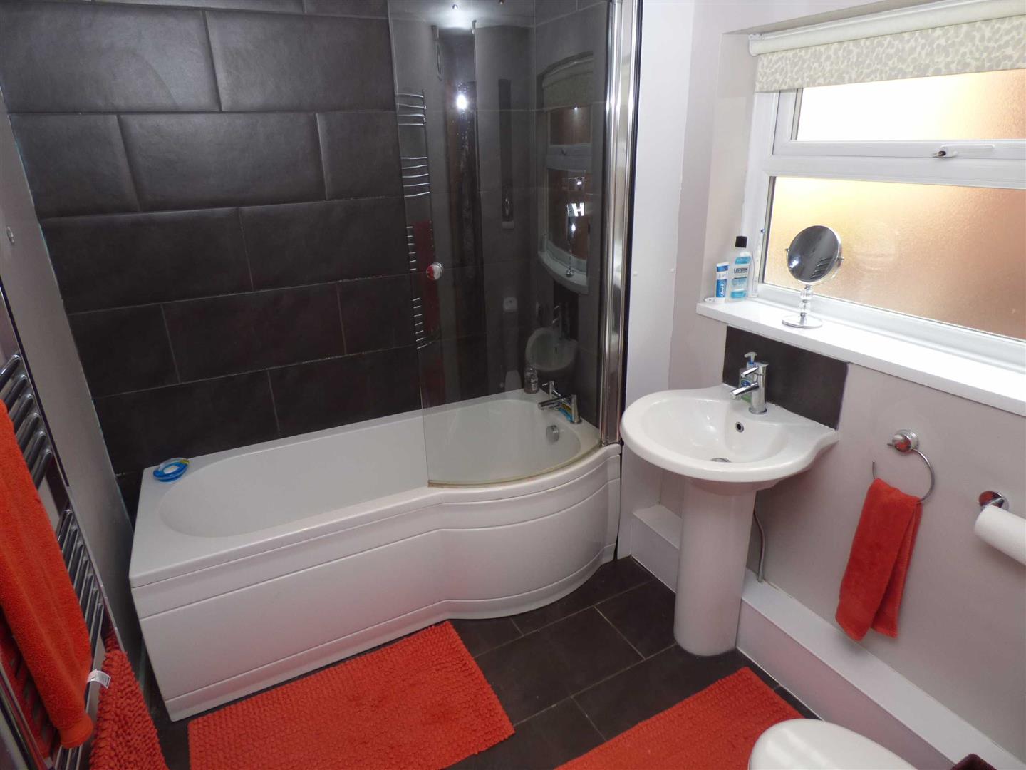 Comprising: low level w.c., pedestal wash hand basin, bath with shower over, extractor, tiled splash backs, heated towel rail, tiled floor, double glazed window to side.