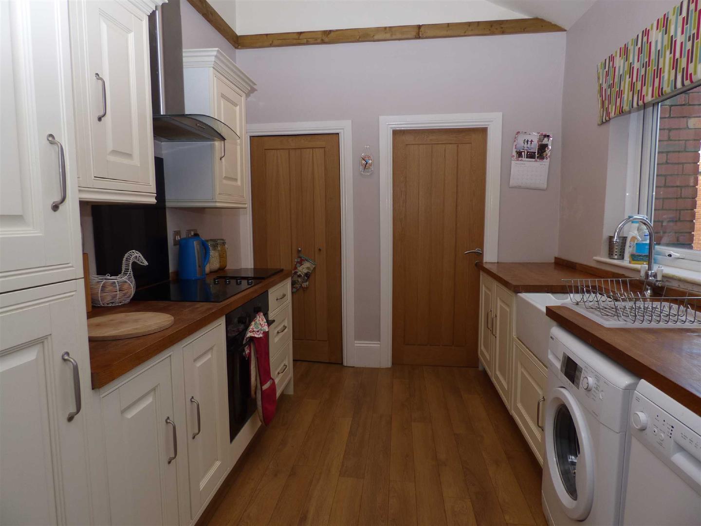 With a range of wall and base units, worktop incorporating sink unit, electric hob, electric oven, extractor, integrated fridge, integrated freezer, freestanding washing machine, freestanding dish washer, tiled splash backs, oak flooring, double glazed window to side, door leading to rear yard.