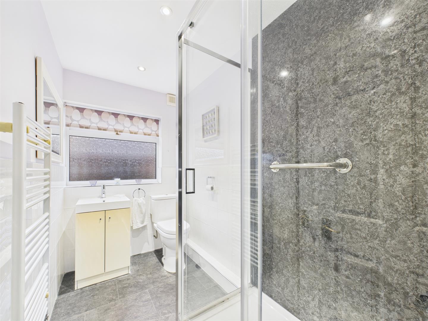 The shower room comprises a step in shower, hand basin housed within a vanity unit, W.C and heated towel rail.