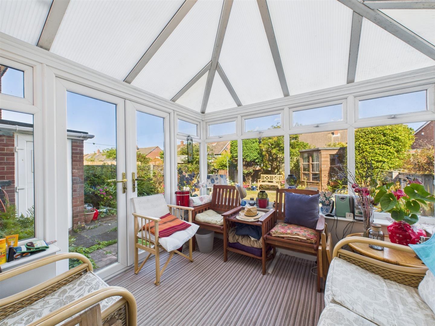 To the rear, the conservatory provides a tranquil setting overlooking the garden, accessed through French doors.