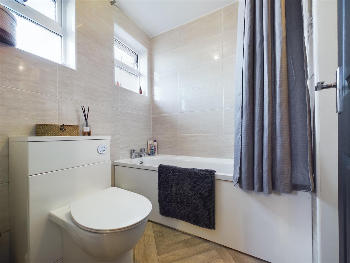 Completing the configuration, the modern bathroom is partially tiled offering a minimalist design and comprises a bath with shower overhead, vanity wash basin with storage underneath and W.C, complete with an integral storage cupboard.