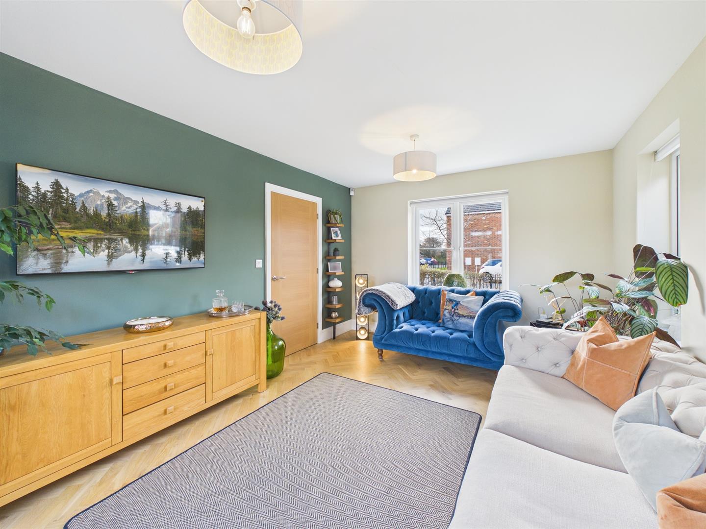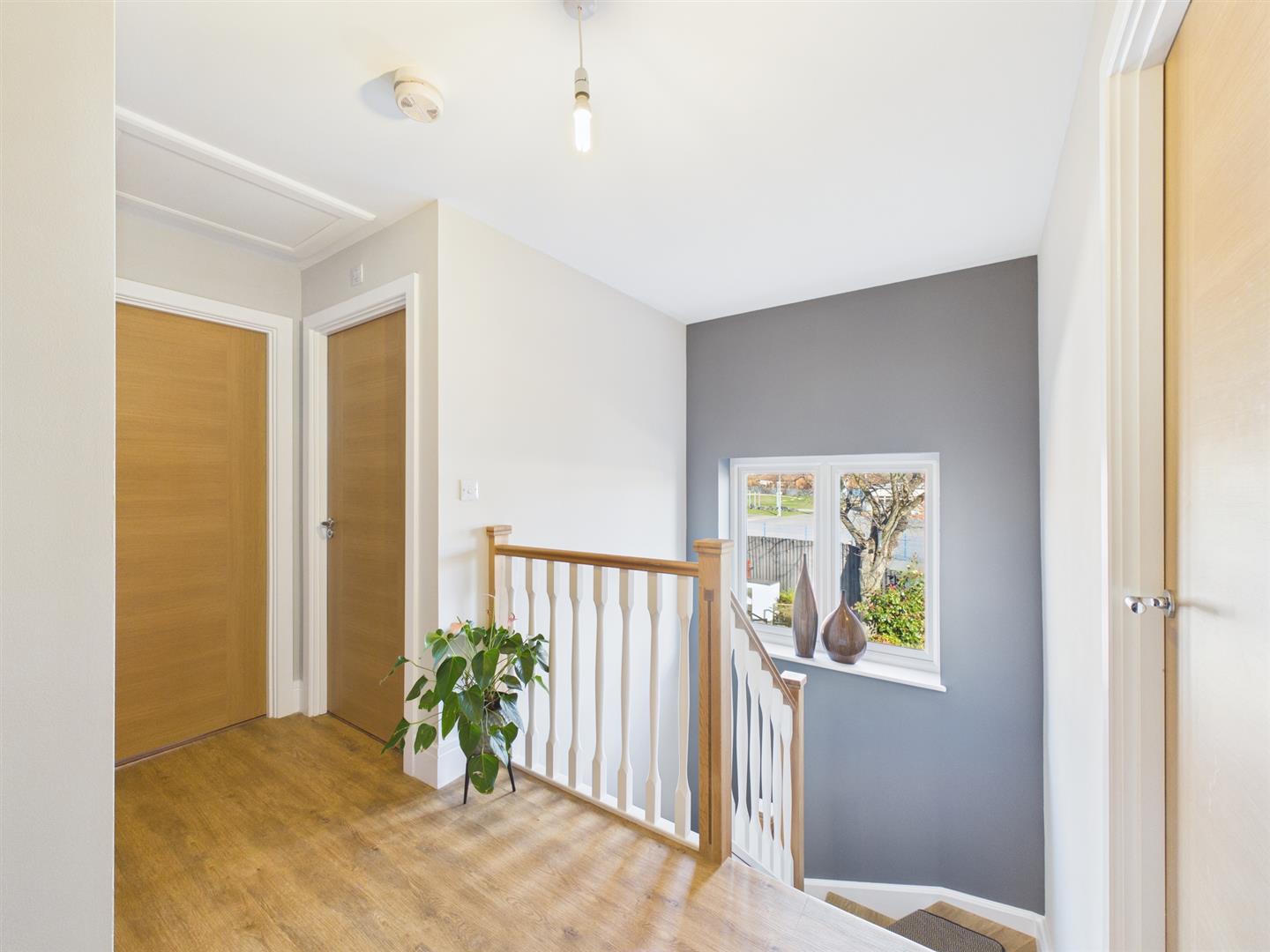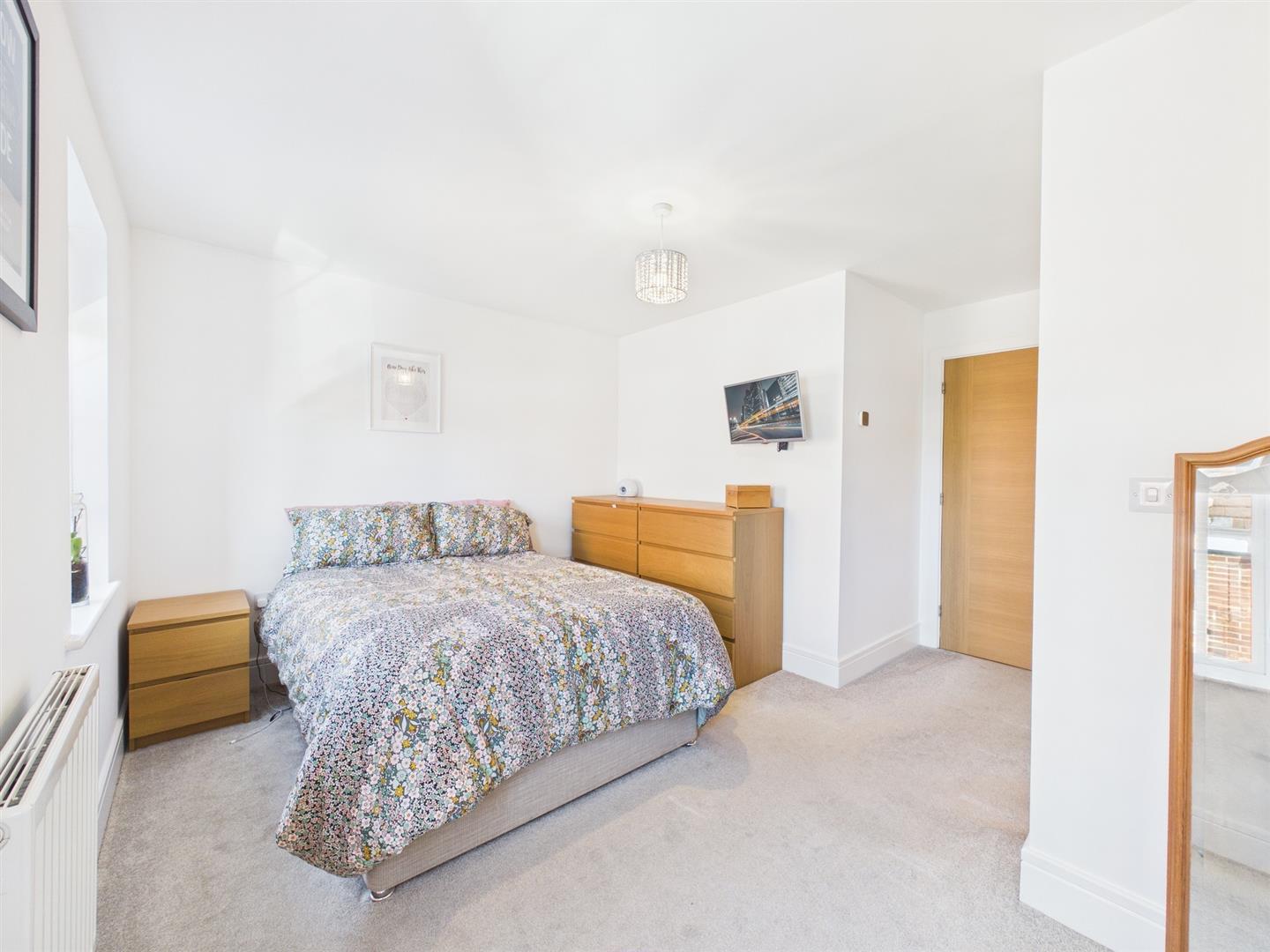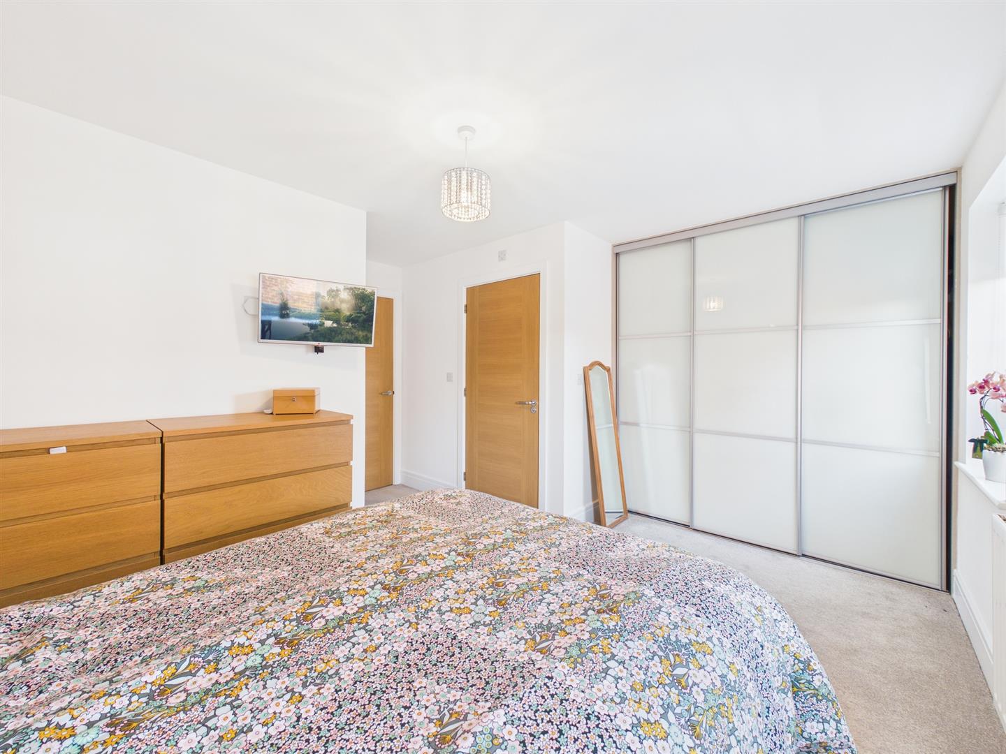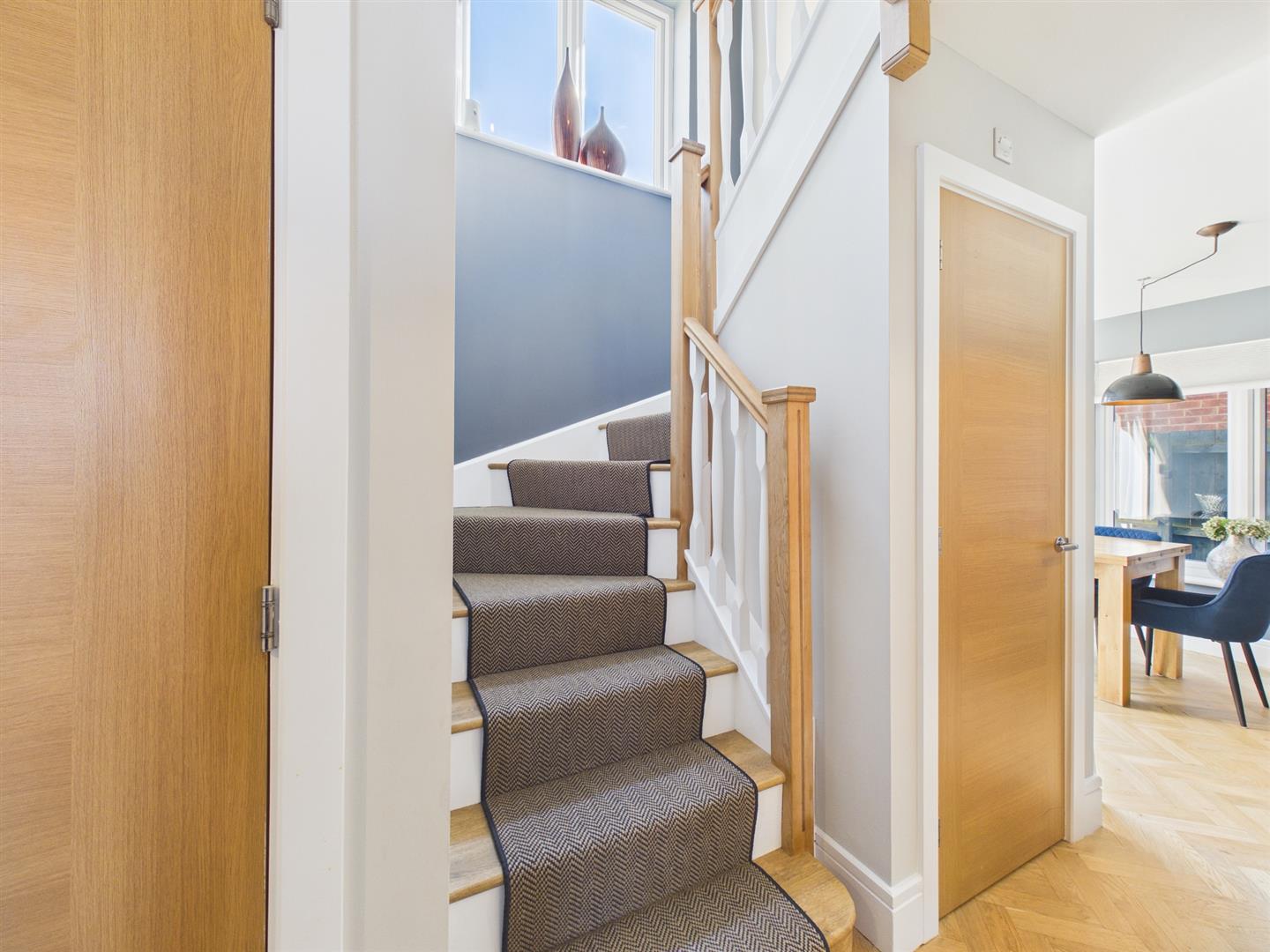 To the first floor, the light and spacious landing connects to all four bedrooms and family bathroom, housing further integral storage. Three of the four bedrooms are double in size and house fitted wardrobes. The primary bedroom also incorporates an en suite shower room, furnished with a walk in rainfall shower, integral WC, heated towel rail and wall mounted bowl style wash basin with storage beneath.