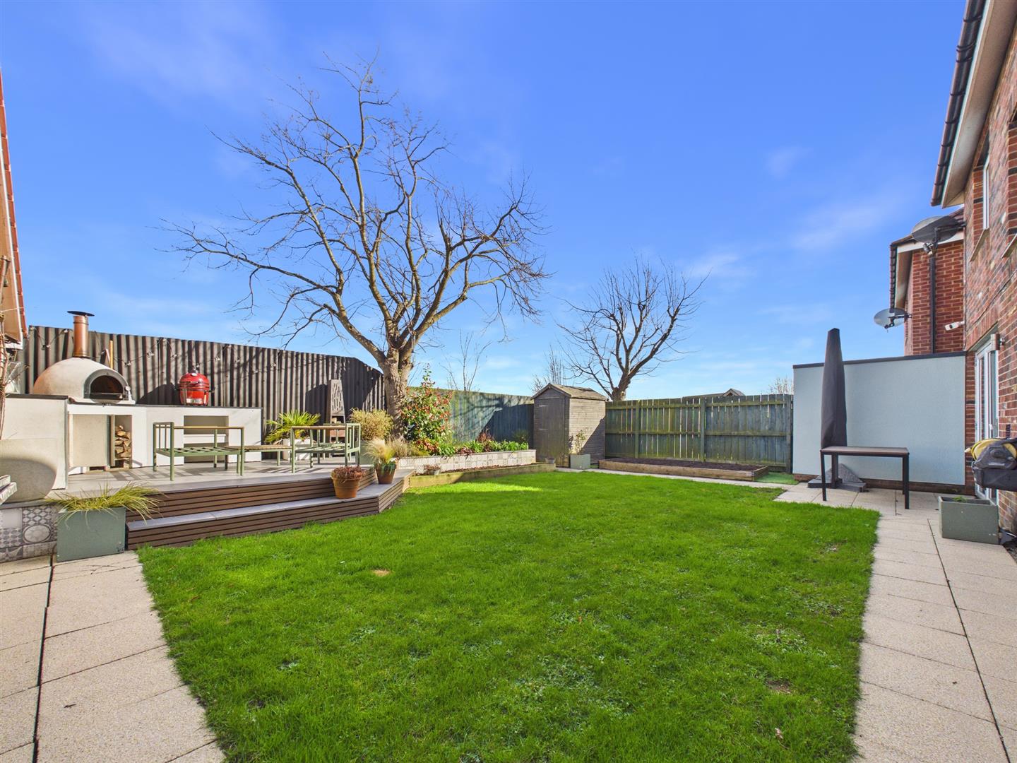 Externally to the rear is a good sized private garden, laid to lawn with a patio surround and raised tiered decking area, housing an outdoor kitchen with marble worktops. The position of the garden ensures a quiet outdoor space to enjoy and socialise, with gate access to the driveway and direct access to the detached garage. Whilst to the front, a small pathway is bordered with lawn, aside the double driveway.