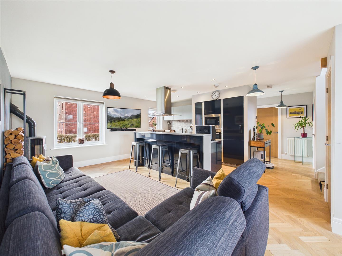 Back to the hallway, the L shaped layout bares round, opening up fully into a contemporary open plan living kitchen diner. Presenting an island layout, the sleek and modern kitchen houses a variety of high gloss wall, base and drawers units framed with stone worktops, whilst integral appliances include: floating extractor hood, four ring gas hob, fridge freezer, dishwasher, eye level oven and microwave. A cupboard beneath with stairs houses fixtures and plumbing for a washing machine. Whilst the island incorporates a raised breakfast bar for dining, the current owners have placed a further dining table towards the bifolding doors, offering an outlook across the rear garden. Completing the space, a further reception area has been created around an industrial style log burning stove.