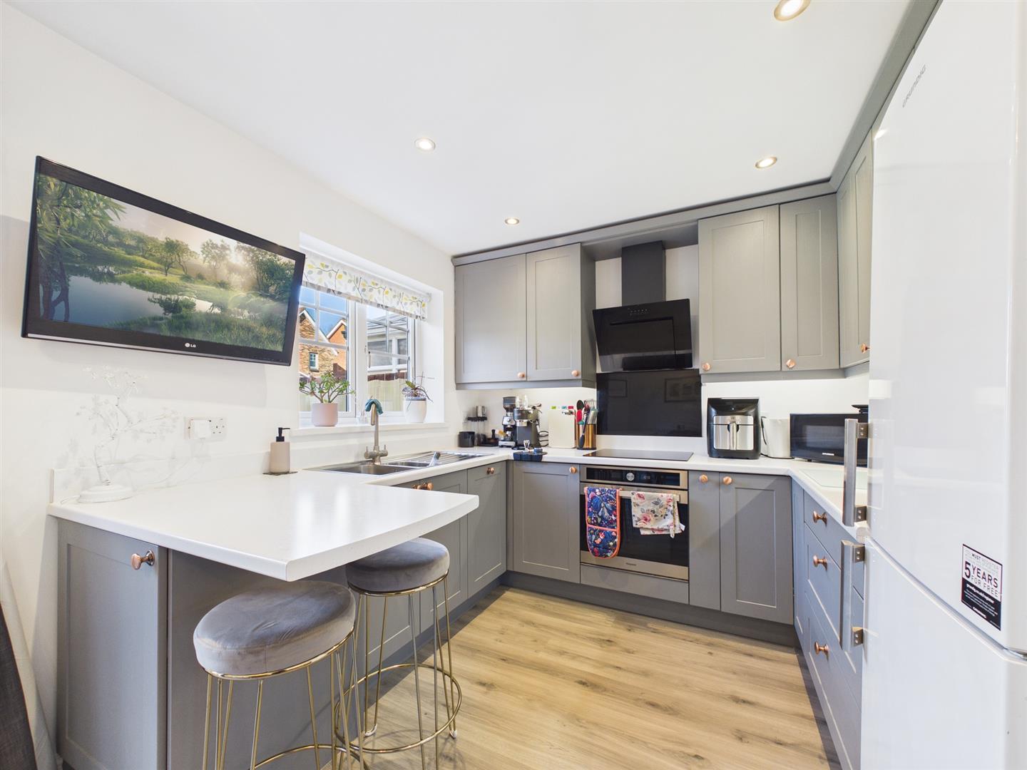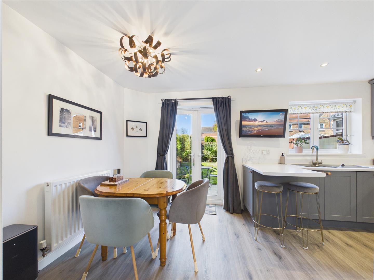 An open archway leads through to a stylish and well-designed dining kitchen, ideally suited to modern family living and entertaining. The kitchen is fitted with a range of units and incorporates an integrated oven, electric induction hob with extractor over, dishwasher and washer/dryer, along with space for a fridge freezer. A breakfast bar and dedicated dining area enhance the versatility of the space, while patio doors open onto the rear garden and a further window provides pleasant views over the outdoor area. A useful understairs cupboard offers excellent storage.