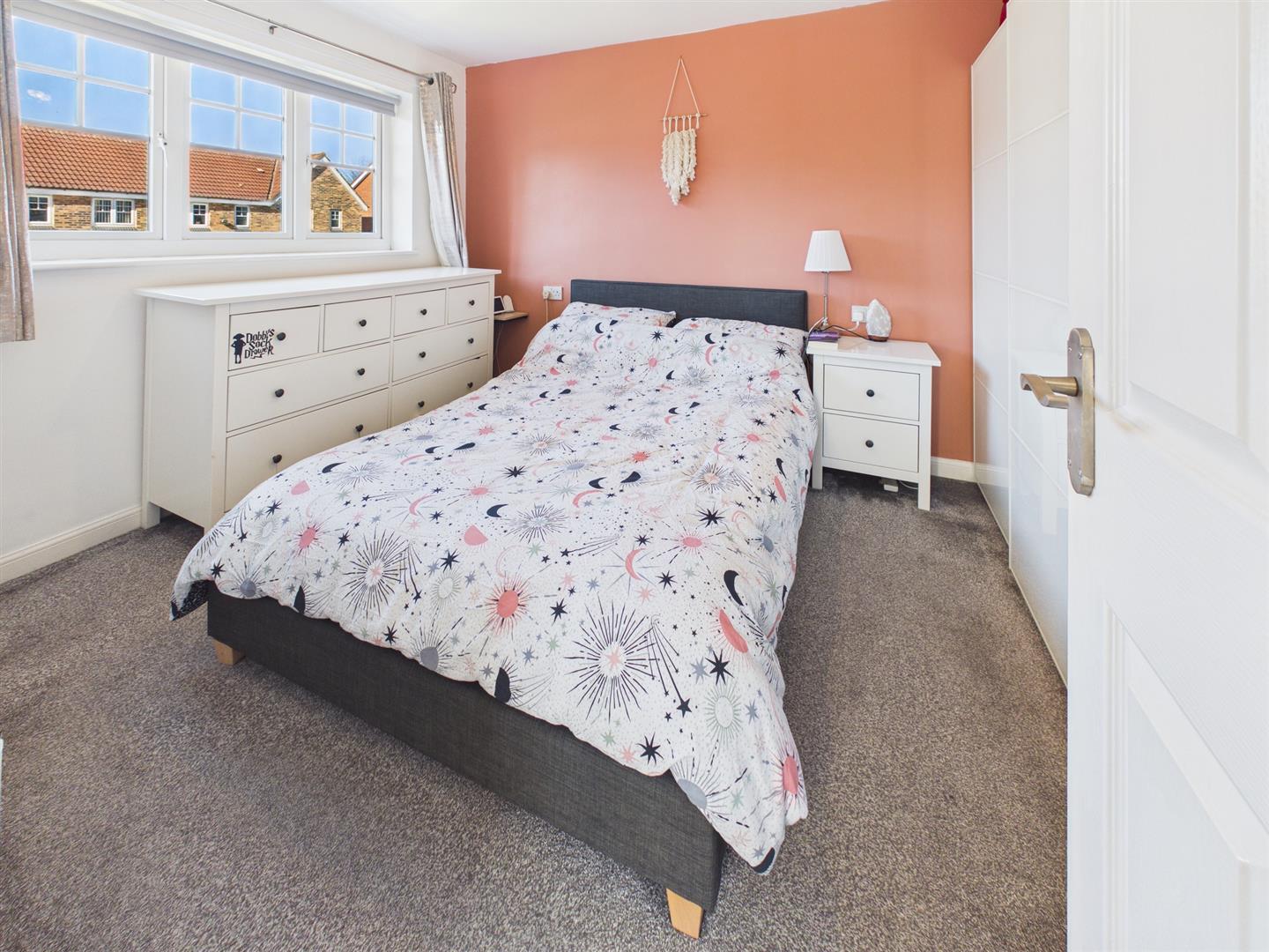 The principal bedroom is a well-proportioned double room positioned to the rear, enjoying views over the garden. Two further bedrooms are located to the front of the property, one of which benefits from a built-in storage cupboard.