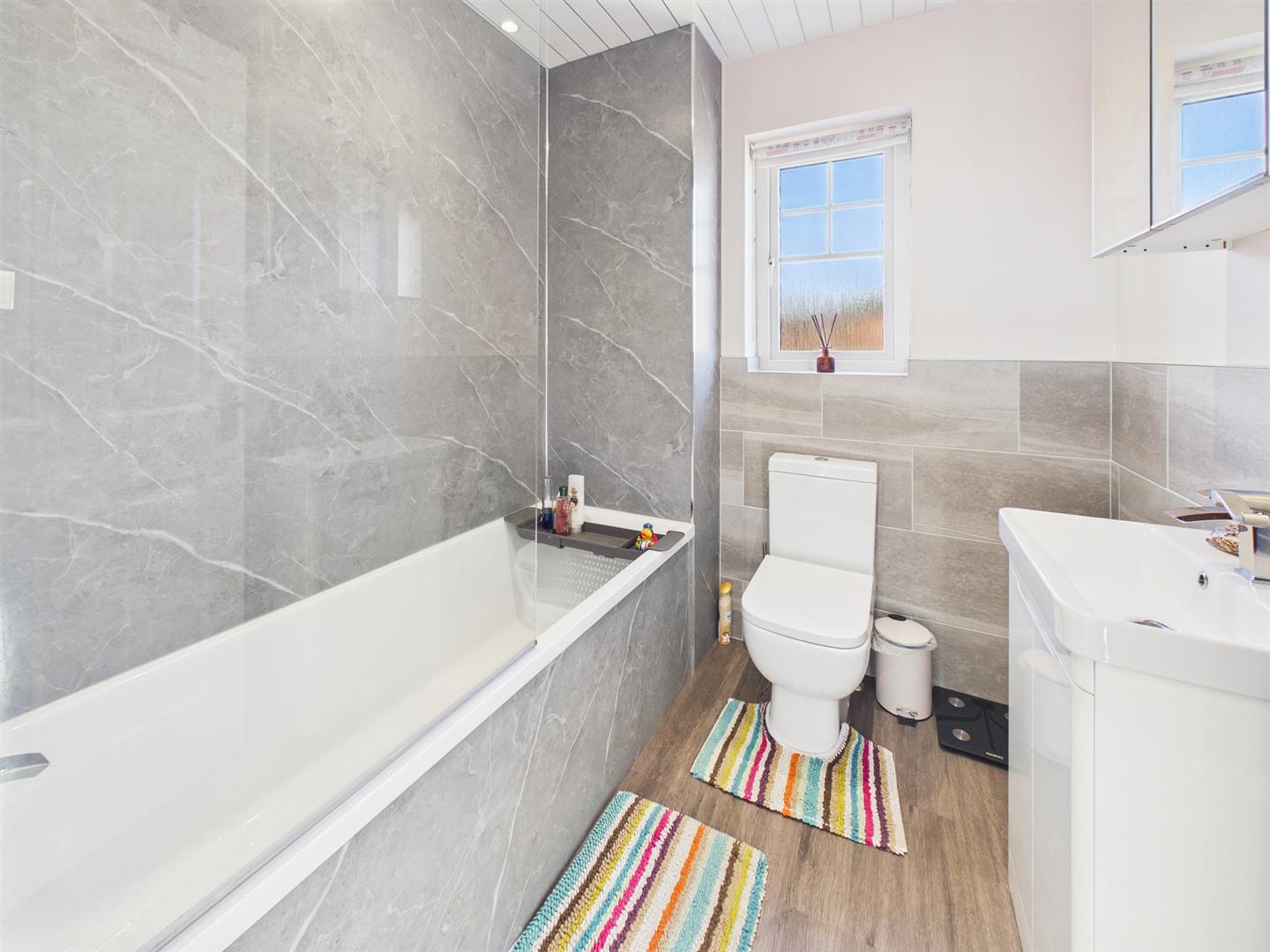 The contemporary family bathroom is fitted with a modern suite comprising a low-level WC, hand wash basin and panelled bath with overhead shower. A heated towel rail completes the space.