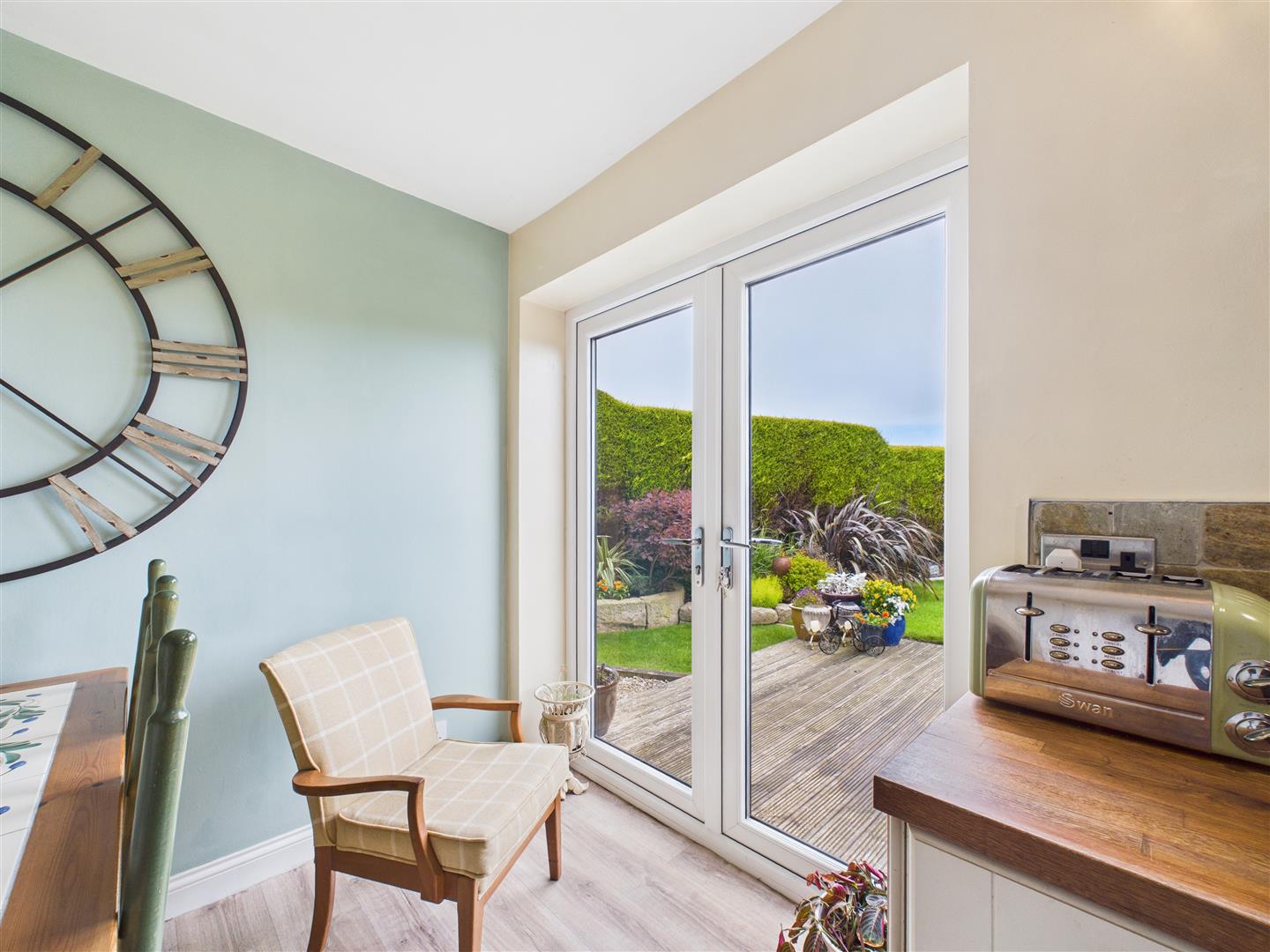 To the right, the sizeable dining room is light and inviting due to the large bay window to the front. Currently utilised for family dining, the space offers the ideal secondary reception area for growing families. Across the hallway, the ample living room mirrors the dining room's design, with the addition of a feature fireplace housing an electric fire and access to the kitchen diner.