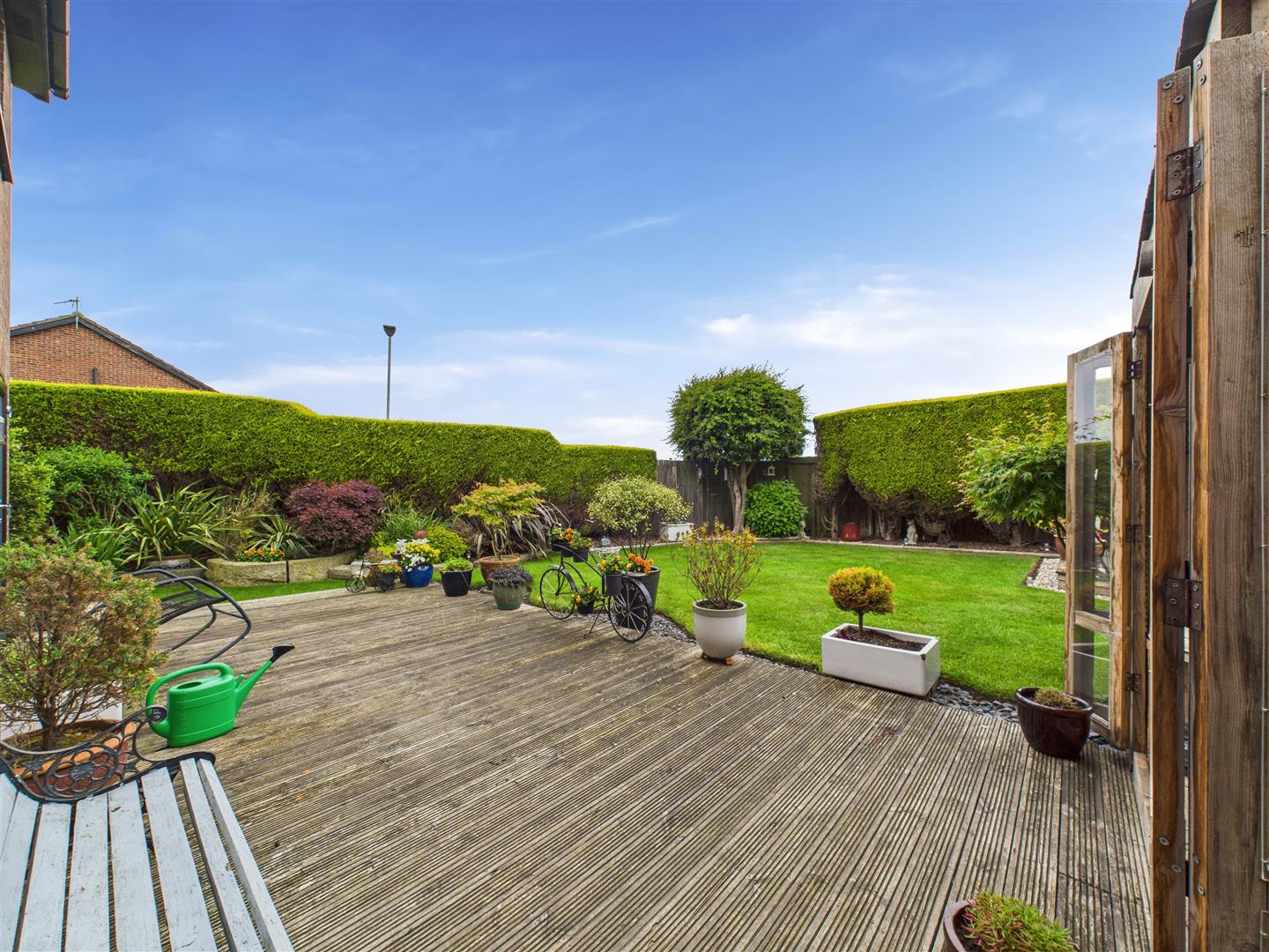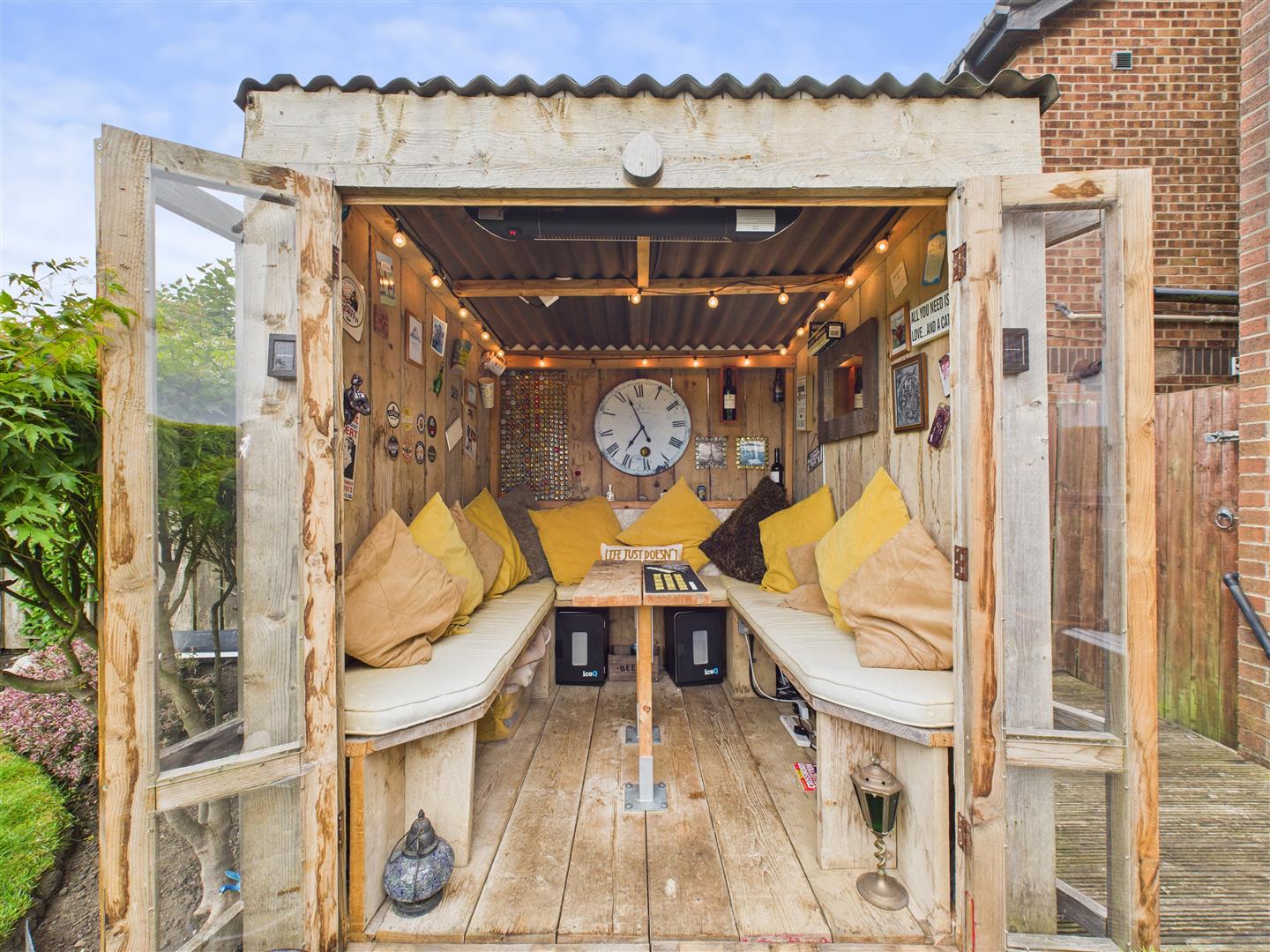 Externally, due to its corner position, the impressive rear garden wraps around the home, bursting with beautiful mature shrubs. Presenting an ample lawn, bordered by raised decking areas, the garden's westerly aspect and ideal position backing onto the local allotments, welcomes the sun throughout the day and late into the evening. The current owners have erected a well sized shed, which has been converted to use as a sheltered external entertainment area, equipped with power, lighting, fixed dining table and bi-folding doors. Privatised by a tall hedge boundary, the garden continues around the home to meet the detached garage, which can be accessed from both sides, sitting aside a greenhouse - an additional benefit for keen gardeners. The front of the home can be accessed via private gates to other side of the property or via the garage, whereby the paved driveway offers off street parking for two cars, complete with a further lawn and shrub borders.