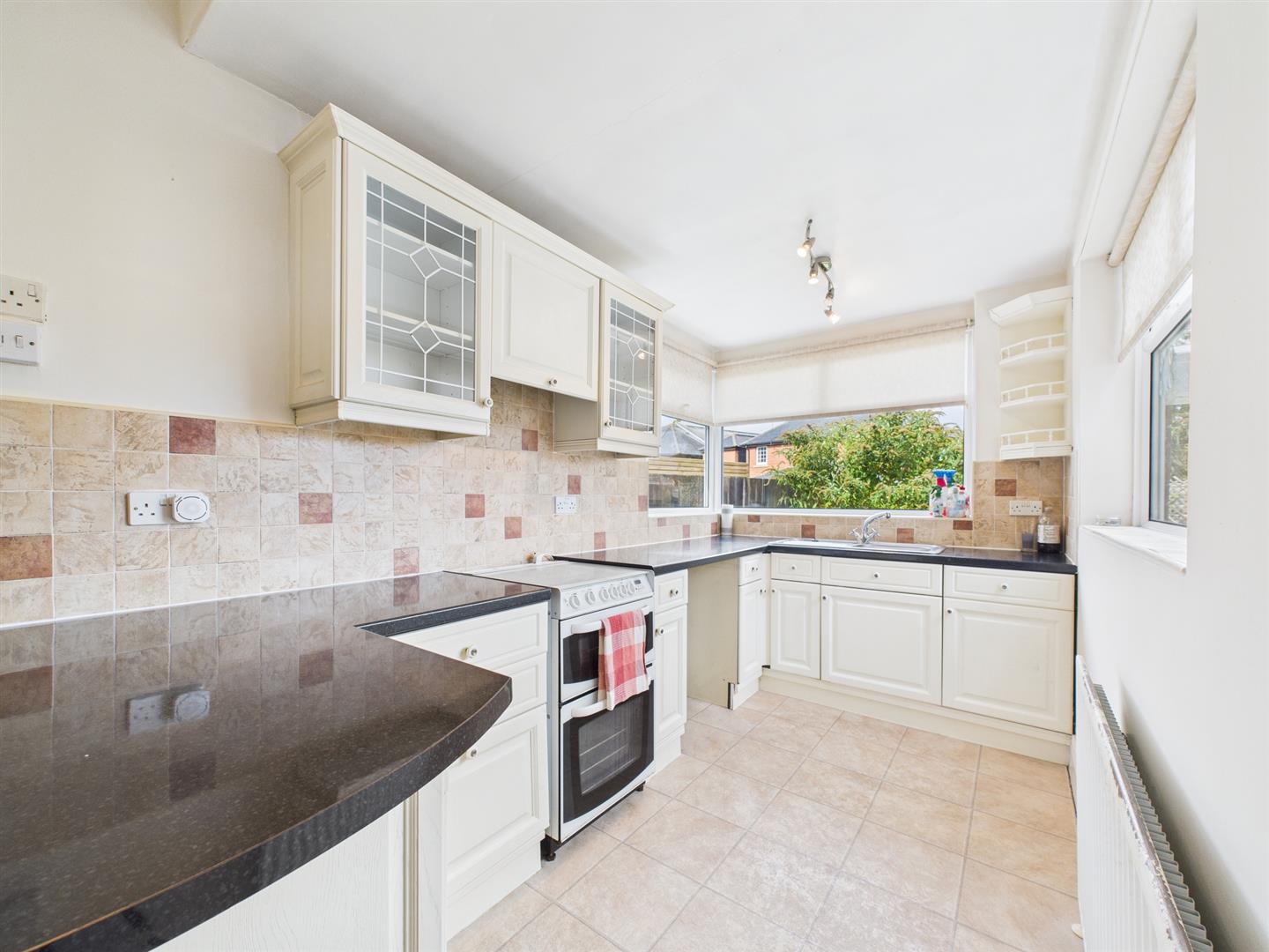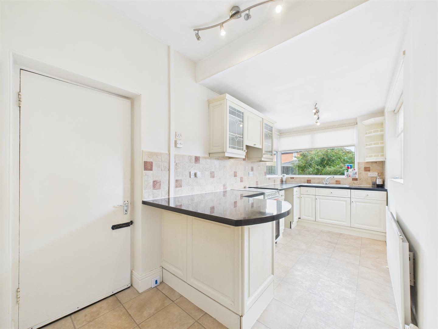 Situated to the rear of the home, the lengthy kitchen is also dual aspect, continuing the flow of natural light throughout the home. Offering several fitted wall, base and drawer units, as well as an integral sink and designated space for further appliances. From the kitchen there is also access to the garage area.