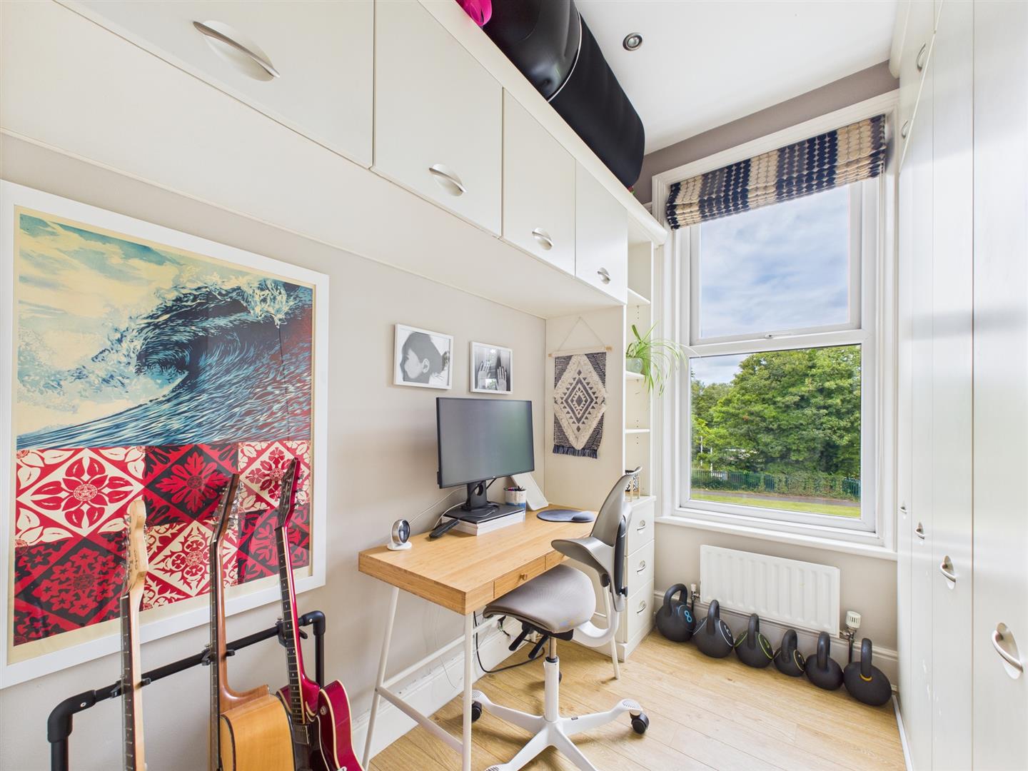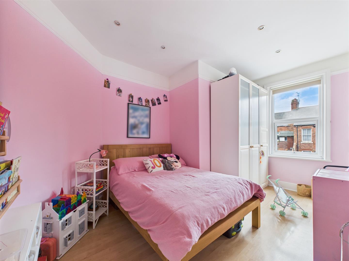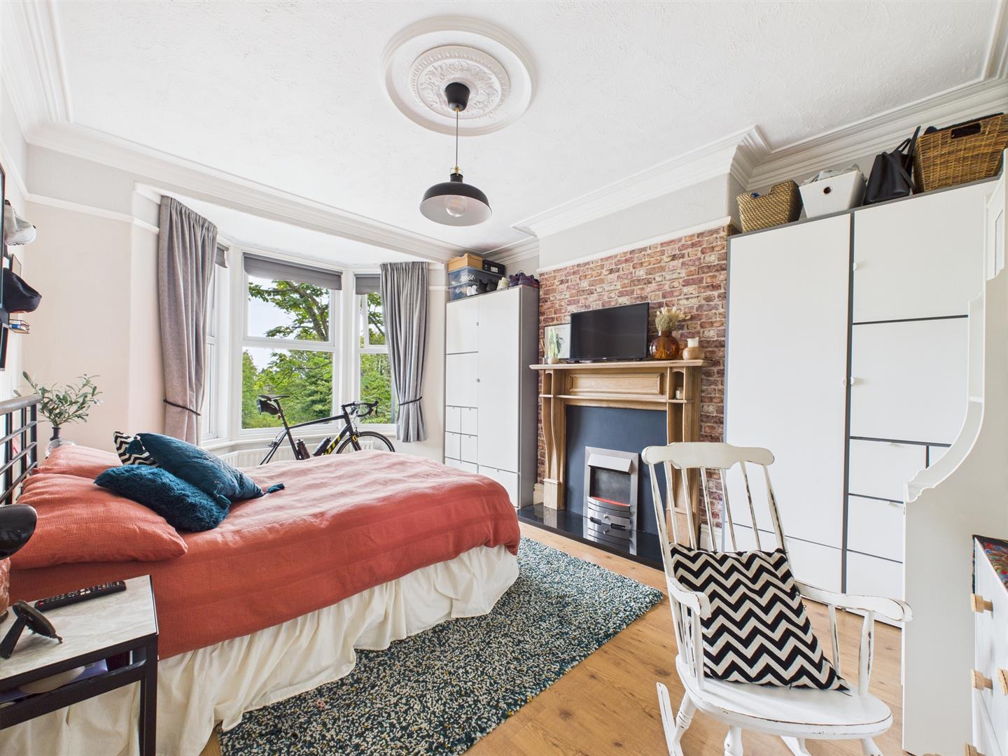 There are three bedrooms, two of which are doubles in size. The main bedroom to the front features high ceilings, decorative coving, feature fireplace and a large bay window. The third bedroom boasts fitted wardrobes providing additional storage.