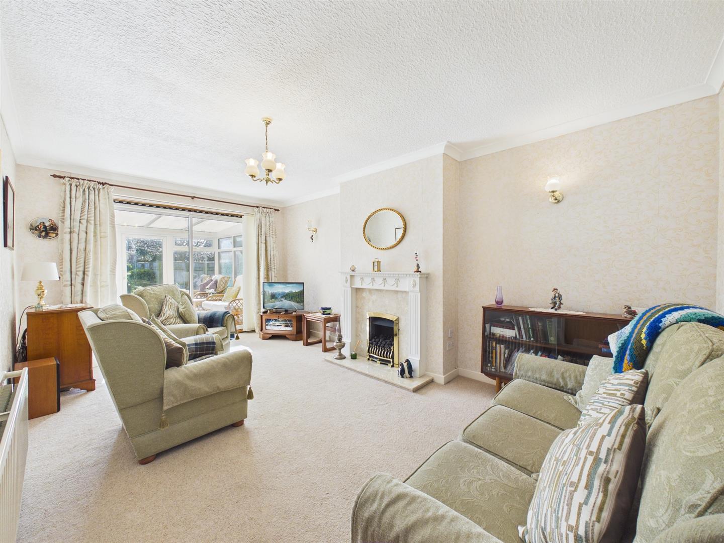 Initially, the living space is expansive in size and flooded with natural light. Furnished with a feature fireplace housing a gas fire, a sliding door leads into the connecting conservatory. Providing an ideal secondary reception space, the conservatory overlooks and offers access to the south facing rear garden.