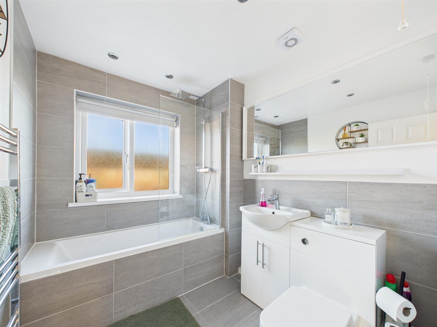To the first floor are three bedrooms and bathroom. Two of the bedrooms are doubles in size and the modern bathroom comprises a bath with shower over, W.C. hand basin housed within a vanity unit and a heated towel rail.