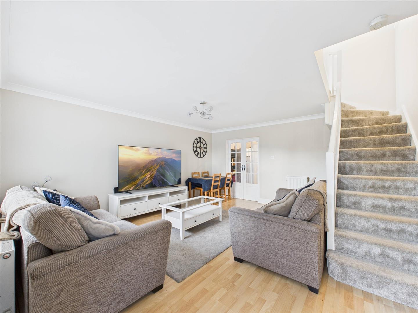 Briefly comprising: Entrance porch to the lounge/diner which overlooks the front of the property and stairs lead to the first floor. Double doors give access to the kitchen which has fitted wall and base units, space for a freestanding oven, American style fridge/freezer, plumbing for a washing machine and dishwasher. French doors open out to the rear garden.