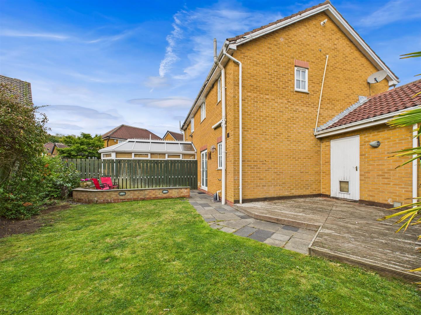 To the rear is a good sized private garden, laid to lawn with a decked area and a paved patio. To the front is a lawn, driveway parking and a garage.