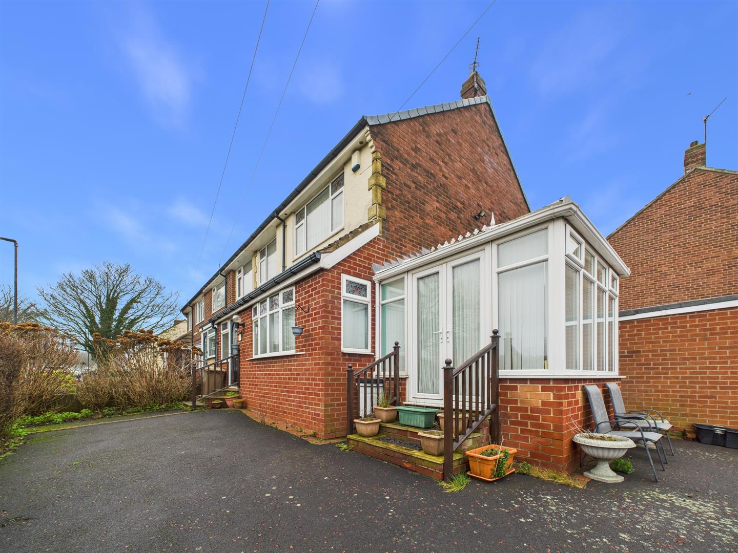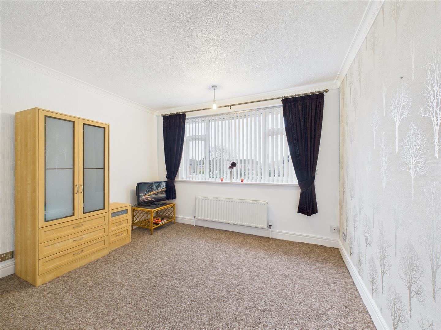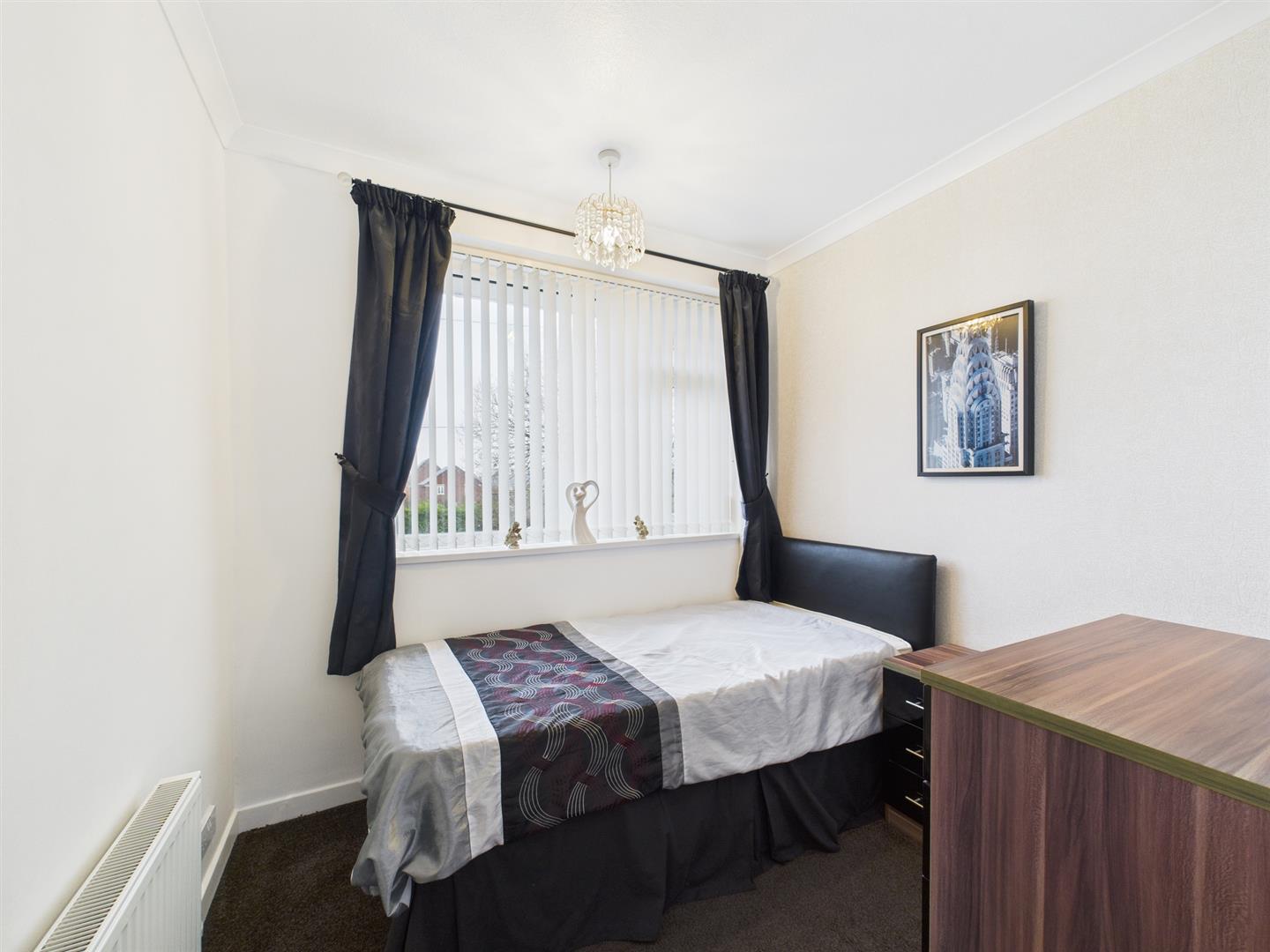 Two bedrooms are generous in size, with the principal bedroom positioned to the front of the property and benefitting from fitted wardrobes. A third bedroom to the front further enhances the home’s suitability for family living.