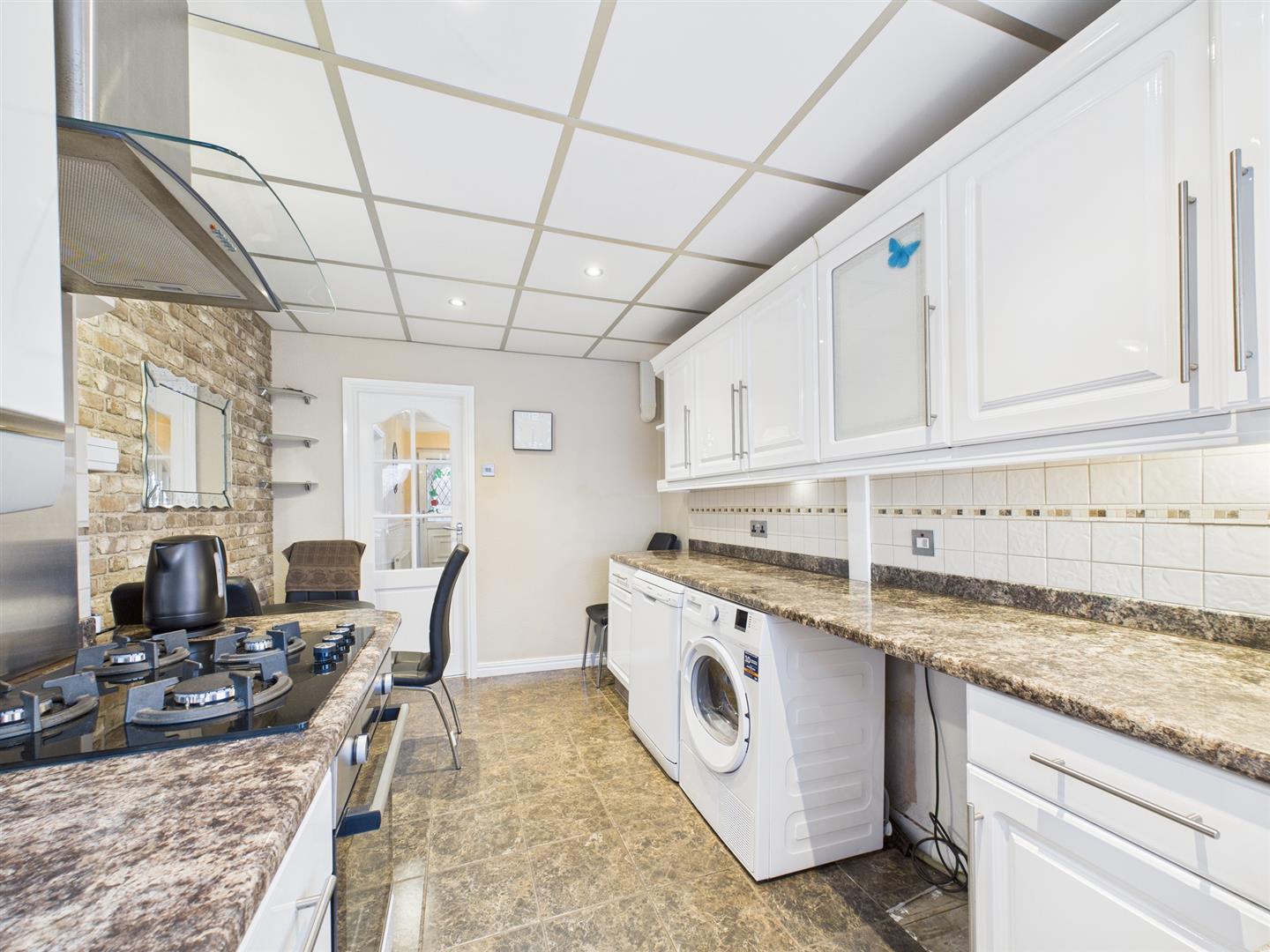 The kitchen is fitted with a range of base and wall units and incorporates a gas hob with oven and extractor hood. There is plumbing for a washing machine and dishwasher, along with space for a dining table. A rear-facing window and patio door provide access to the rear yard.