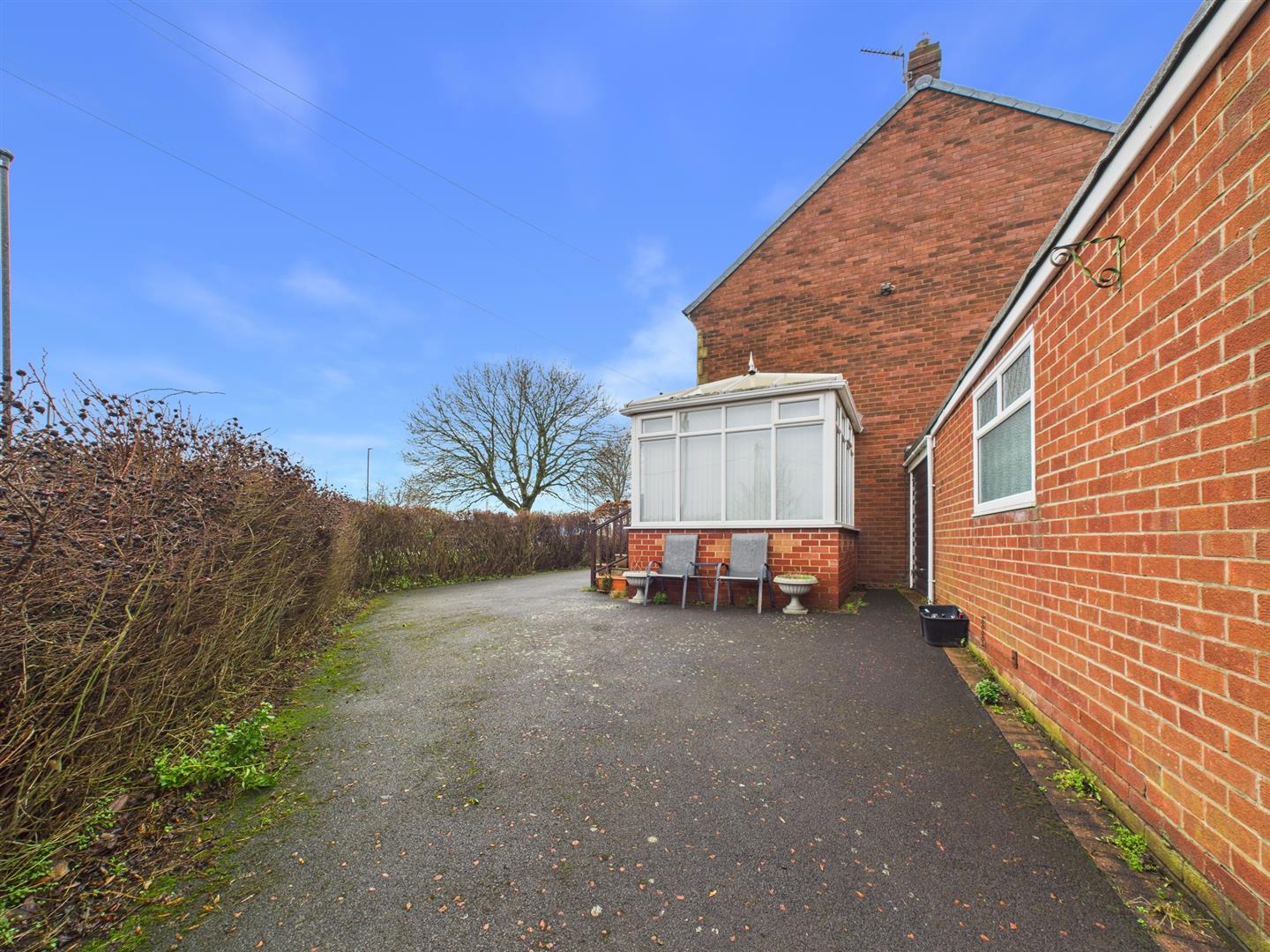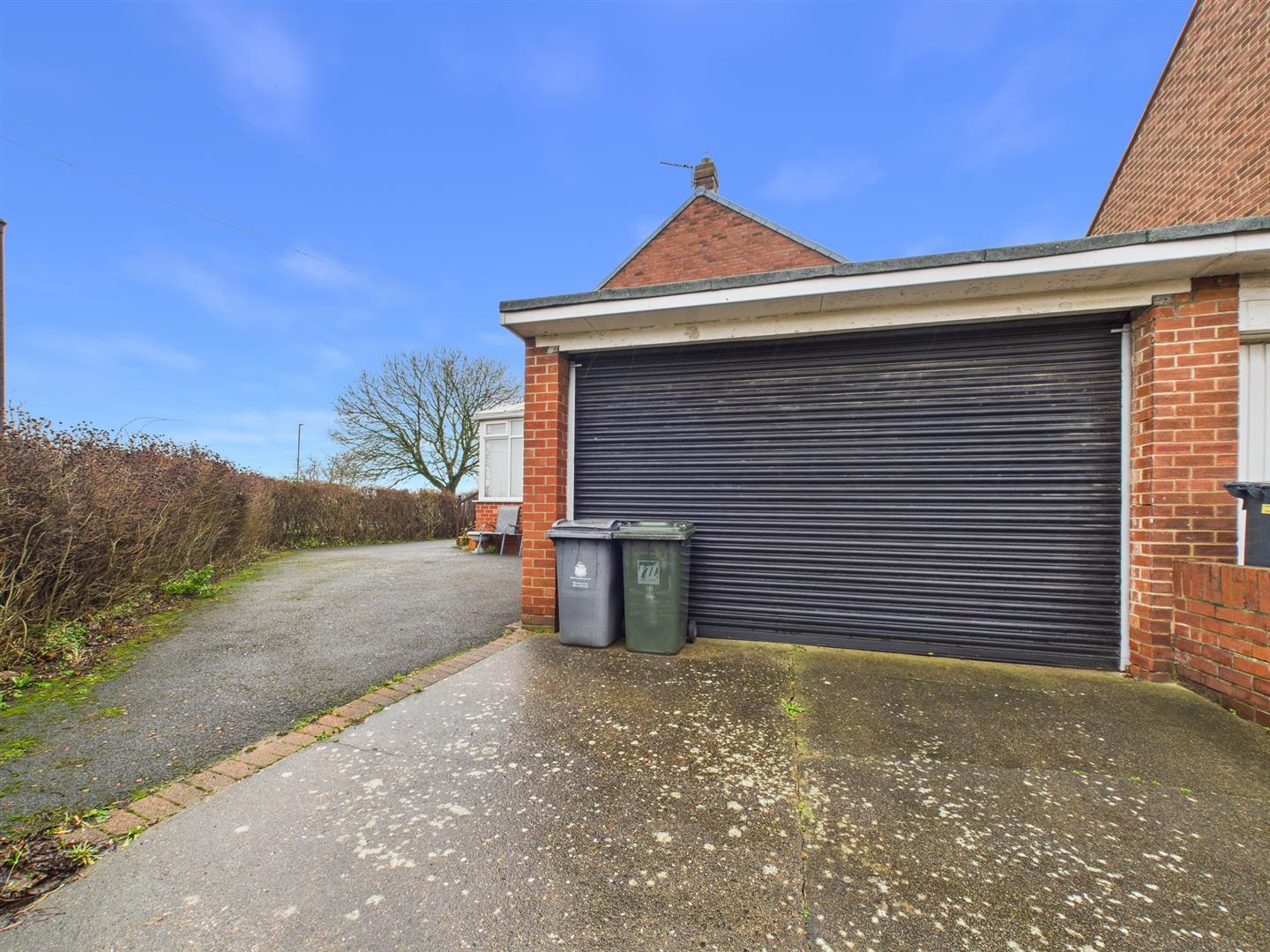 Externally, the property benefits from a small rear yard with a storage shed and access to the garage. To the front and side is a large enclosed paved garden, along with a driveway and double garage, currently housing a vehicle inspection pit, providing off-street parking.