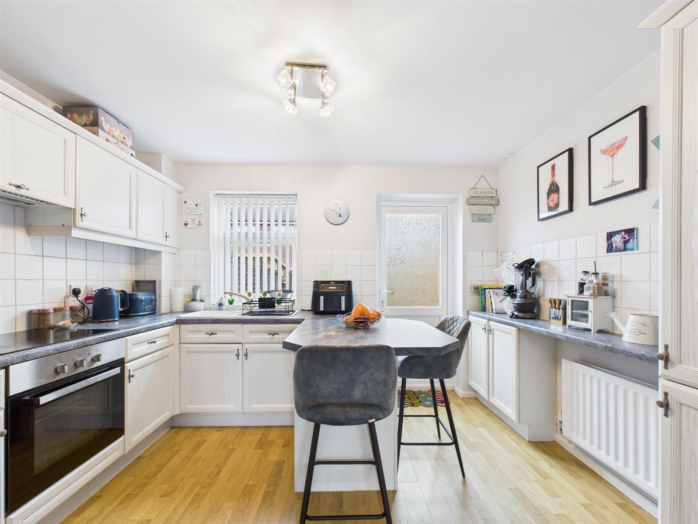 Briefly comprising: Entrance directly to the living room which is open plan through to the kitchen and stairs lead to the first floor. The kitchen/breakfast room is well equipped with fitted wall and base units as well as a peninsular offering seating. Integrated appliances include an induction hob, electric oven, extractor fan, space for a fridge/freezer and plumbing for a washing machine. A door gives access out to the rear garden.