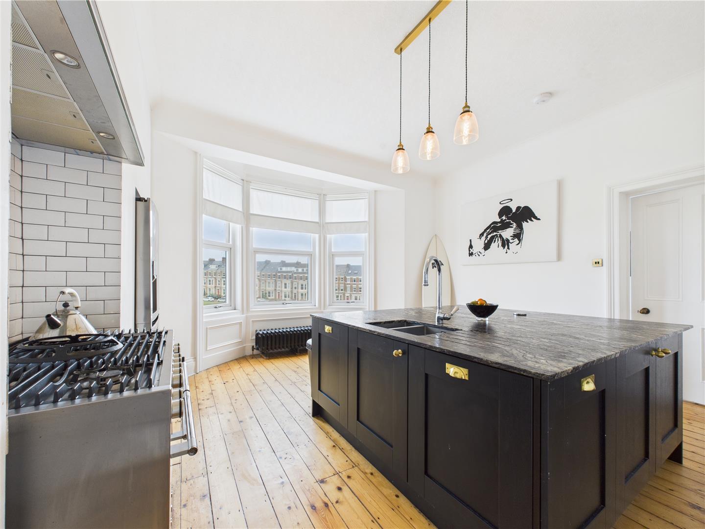Briefly comprising: Secure communal entrance with stairs leading up to the private hallway. The stylish kitchen offers a generous amount of space with a large bay window to the front offering open views over the green and towards Long Sands Beach. A central island houses a sink, dishwasher and washer/dryer as well as providing excellent storage. There is space for a free standing Range style oven and a fridge/freezer. The dining room leads on from the kitchen with an additional raised office/study nook. From the dining room is the impressively sized living room featuring high ceilings, gas fire place with marble surround, a large bay window with wonderful views and cornicing. Throughout this space are the original floorboards and beautiful cast iron radiators.