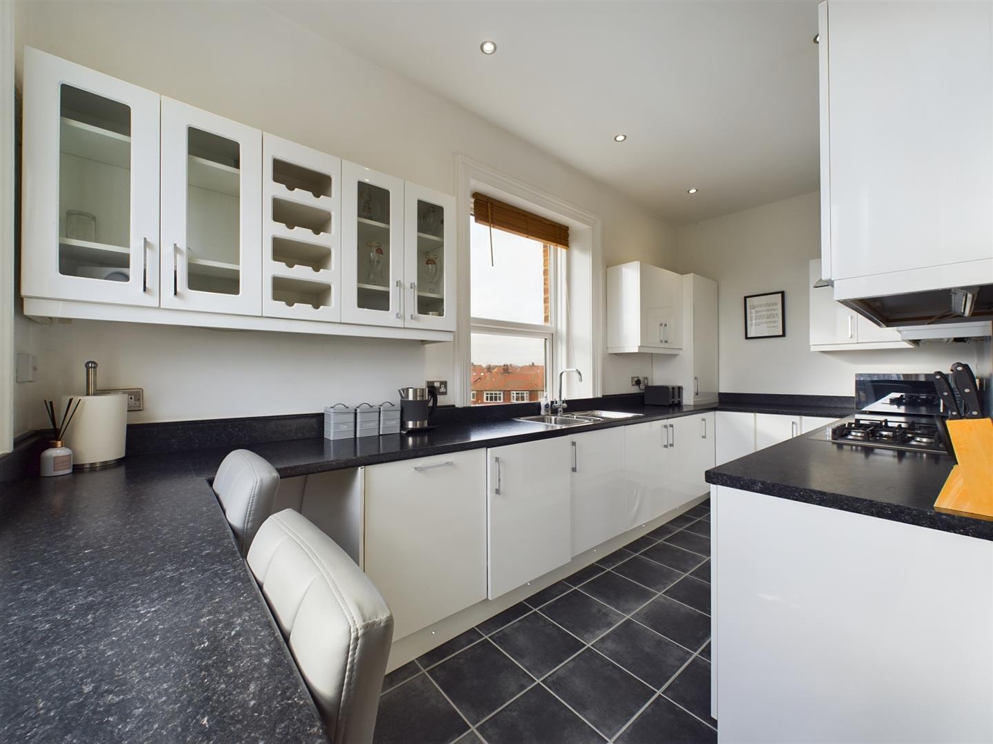 Briefly comprising; Communal entrance leading to the second floor. The private entrance leads into a good sized hallway with a storage cupboard. The bright and spacious living room offers a dual aspect with views over Percy Park. This well presented room features high ceilings and a fireplace. Double doors lead through to the modern kitchen which is flooded with light from the tall sash windows. A range of wall and base units provide plenty of storage space, there is a breakfast bar for dining, range cooker, dishwasher and washing machine. The double bedroom is of a good size, with built in wardrobes providing plenty of storage. The beautifully fitted bathroom consists of a bath with over bath shower, sink and W.C.