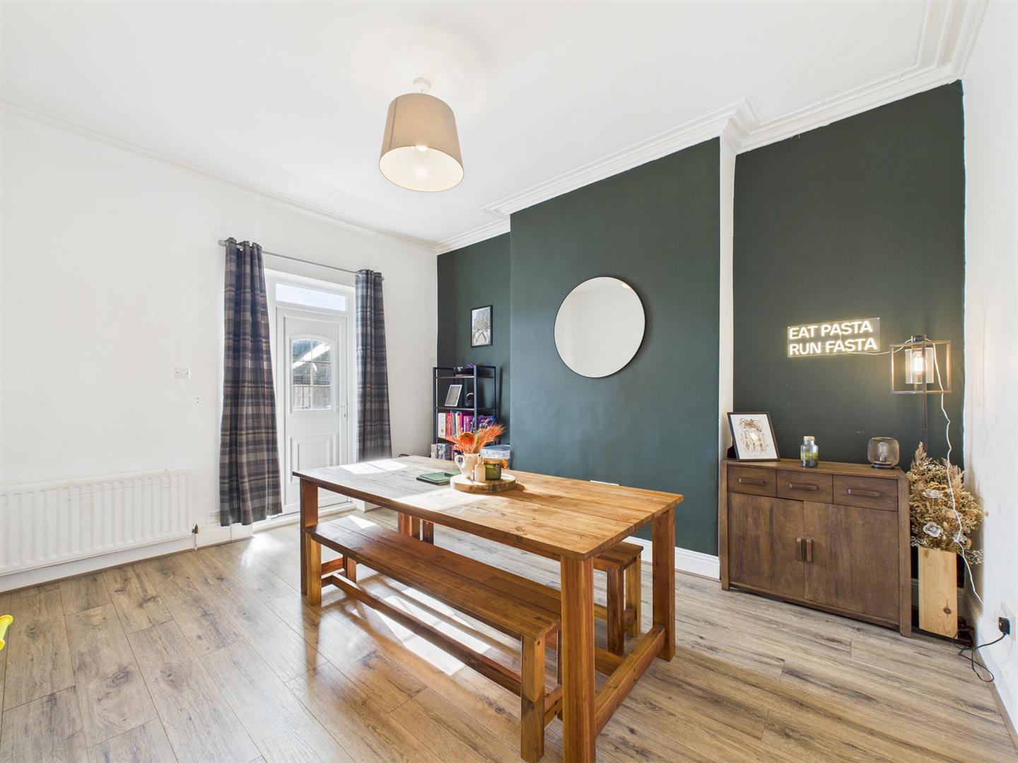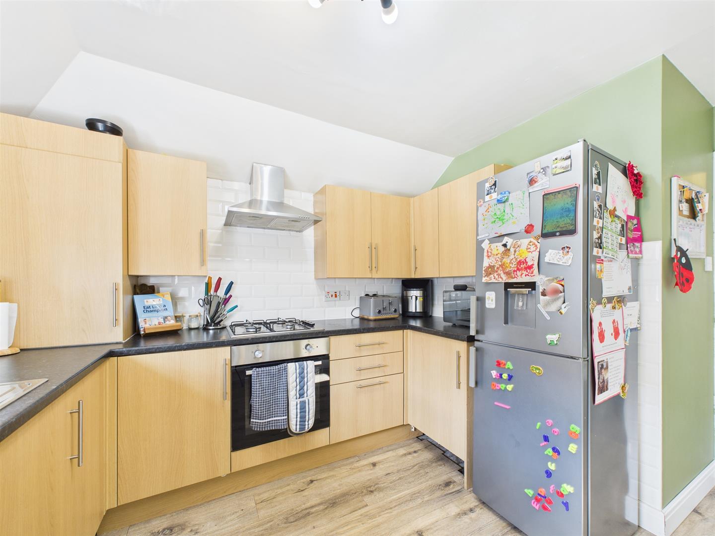 Briefly comprising: Secure communal entrance to a private hallway with stairs to a spacious split level landing. The living room overlooks the front offering a comfortable space with an exposed brick fire breast housing a log burning stove. The kitchen has fitted wall and base units including an integrated gas hob, electric oven, extractor, space for a freestanding fridge/freezer and plumbing for a washing machine. The bathroom comprises a bath with shower over, hand basin and W.C. There are two bedrooms on this floor, one is particularly generous in size and is being utilised as a dining room, a door opens out to a staircase leading down to the rear yard. Part of the stairs have been decked to provide a pleasant small seating area.