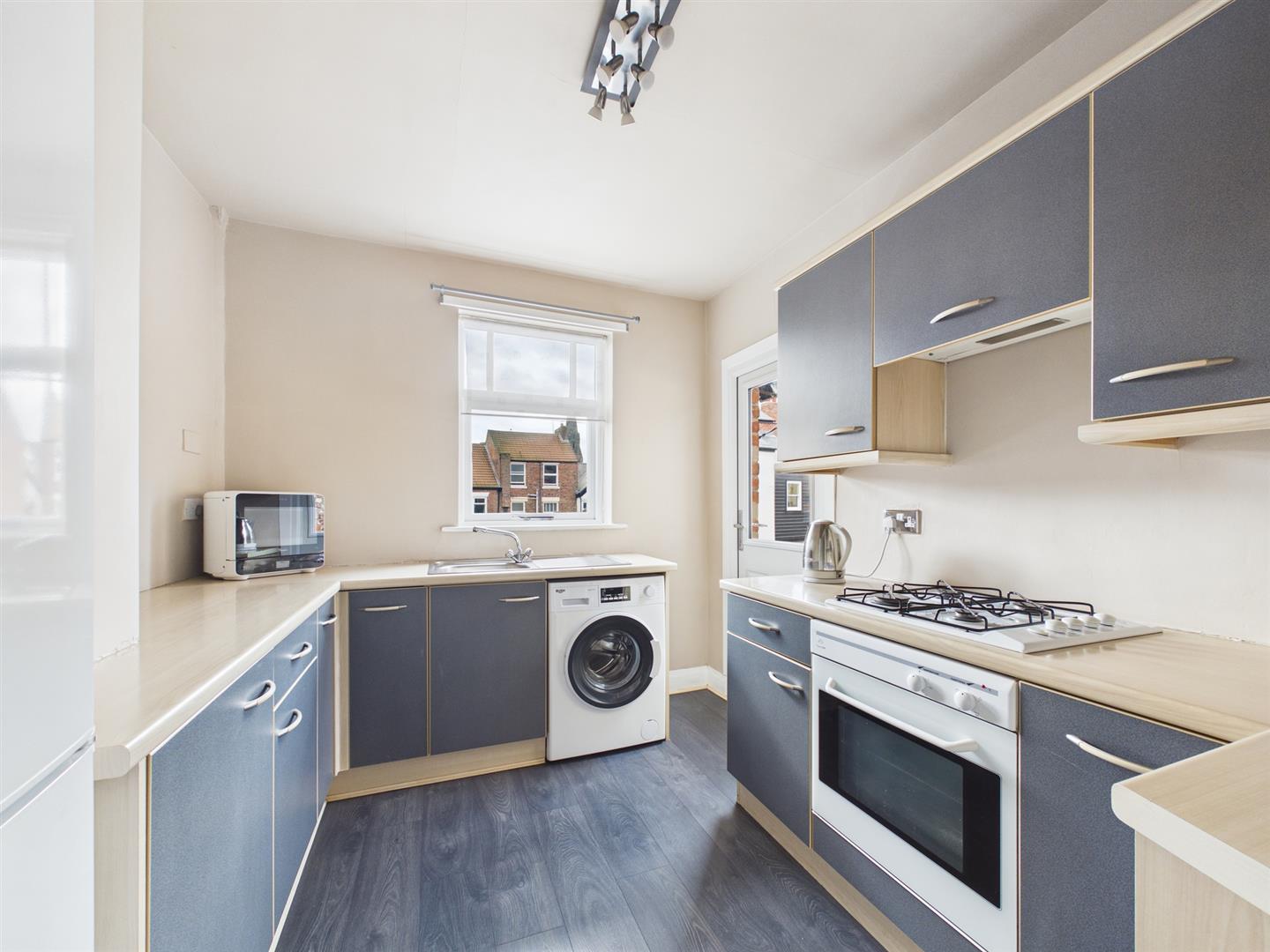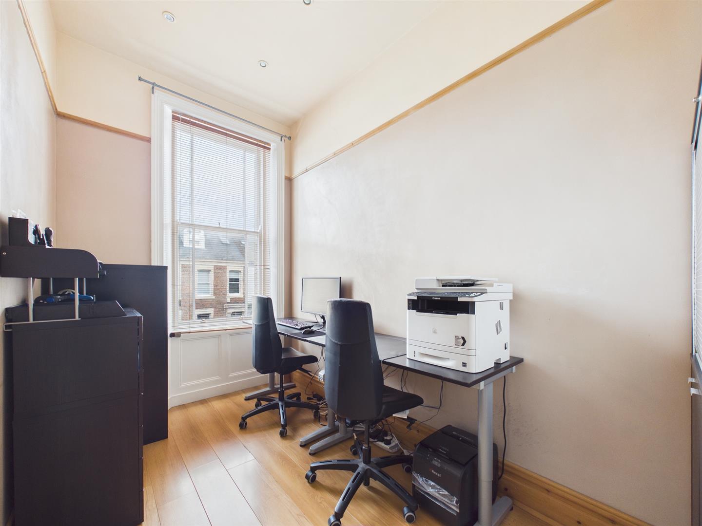 The kitchen has fitted wall and base units, including a gas hob, oven, space for a fridge and plumbing for a washing machine. A door offers access out to stairs down to the rear yard and garage. To complete this floor is a bedroom which is currently being utilised as a home office.