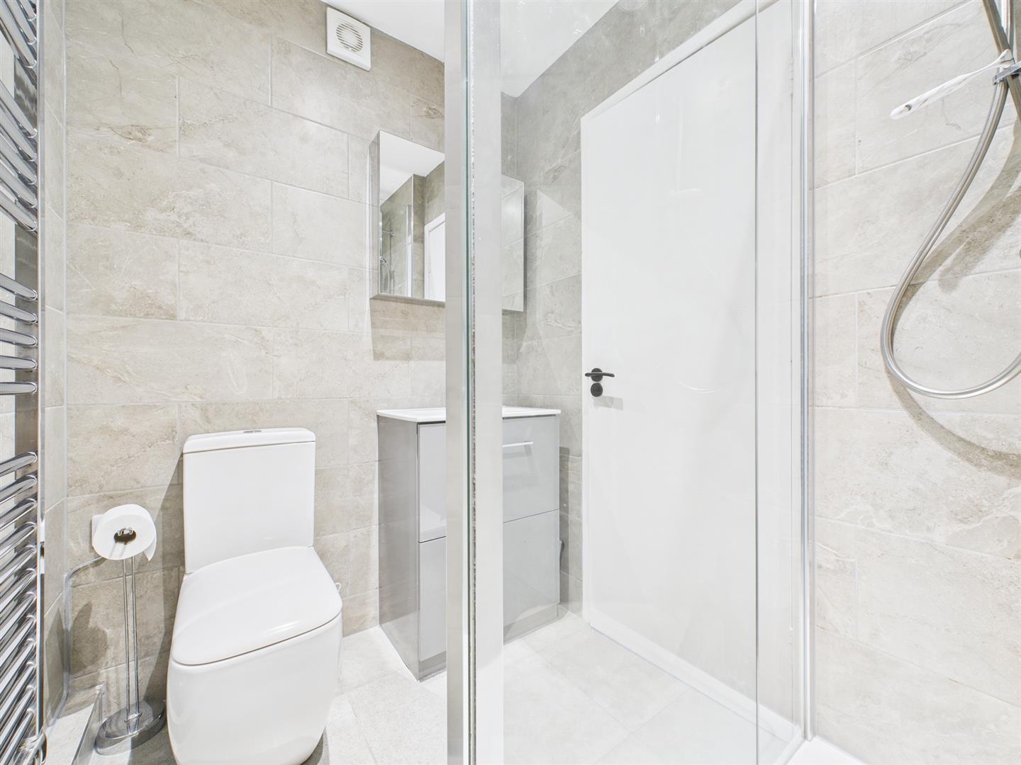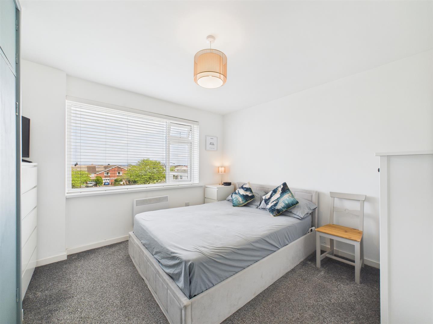 To the right, the two bedrooms are accessed. Both are double in size, house fitted wardrobes and large picture windows, with views towards the sea. Across the hallway, the refurbished bathroom has been thoughtfully configured, presenting a sleek and modern design. Furnished with a walk in rainfall shower, WC, heated towel rail and vanity wash basin, with storage beneath.