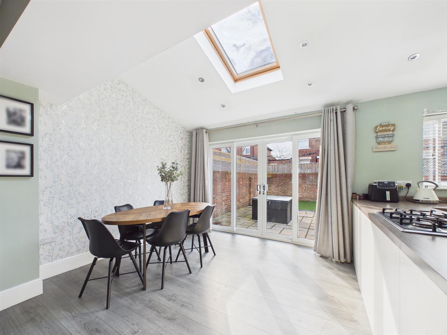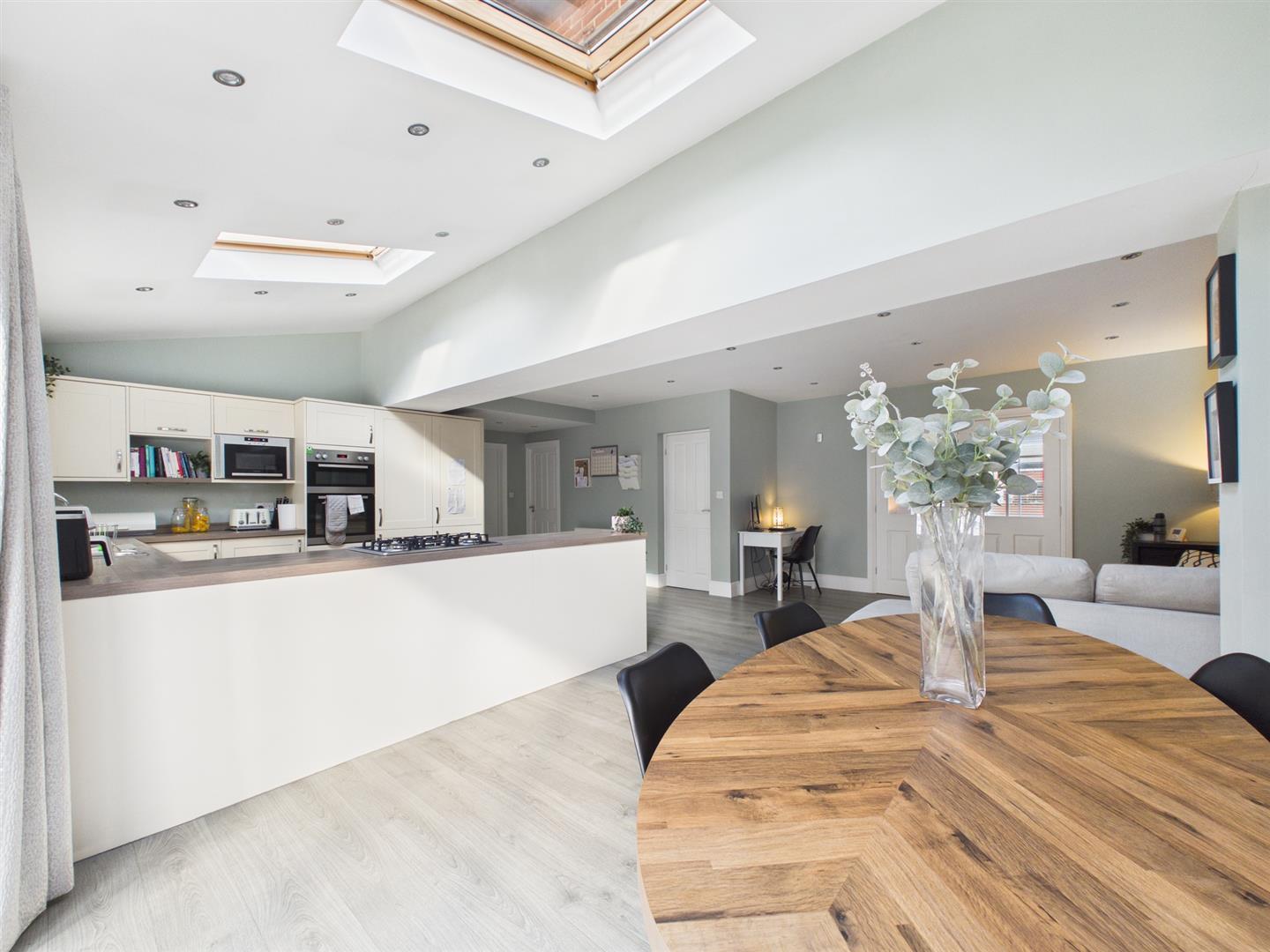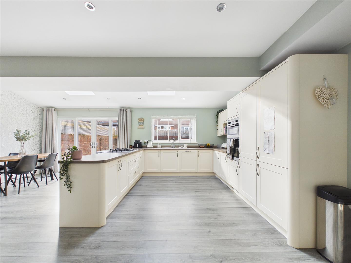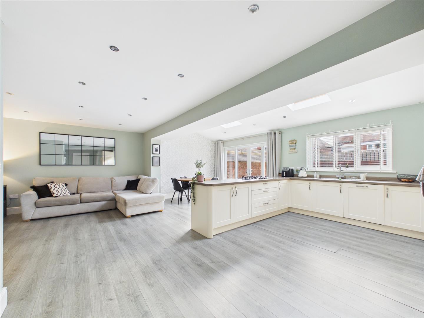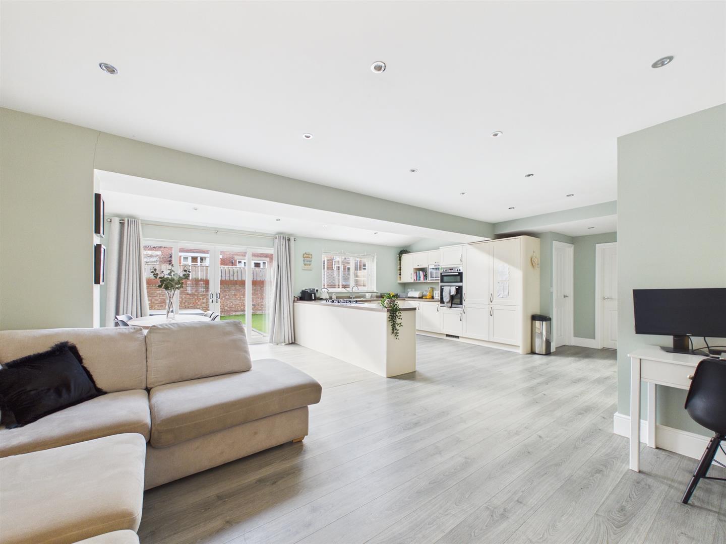 Briefly comprising: Entrance vestibule to a welcoming hallway. Overlooking the front of the property is a bright and airy living room featuring a large window. Double doors give access to a spacious open plan kitchen/diner/family room, extended to offer a fantastic sociable space which is perfect for family living and entertaining friends. Sliding patio doors open out to the rear garden and a partially vaulted ceiling has Velux windows to allow plenty of light to fill the room. The kitchen has an extensive range of modern wall and base units, integrated appliances include a five ring gas hob, double oven, microwave, dishwasher, fridge/freezer and freezer. A handy utility room provides additional storage, sink, plumbing for a washing machine, tumble dryer and a door out to the rear garden. To complete the ground floor is a shower room comprising a step in shower, hand basin and W.C.
